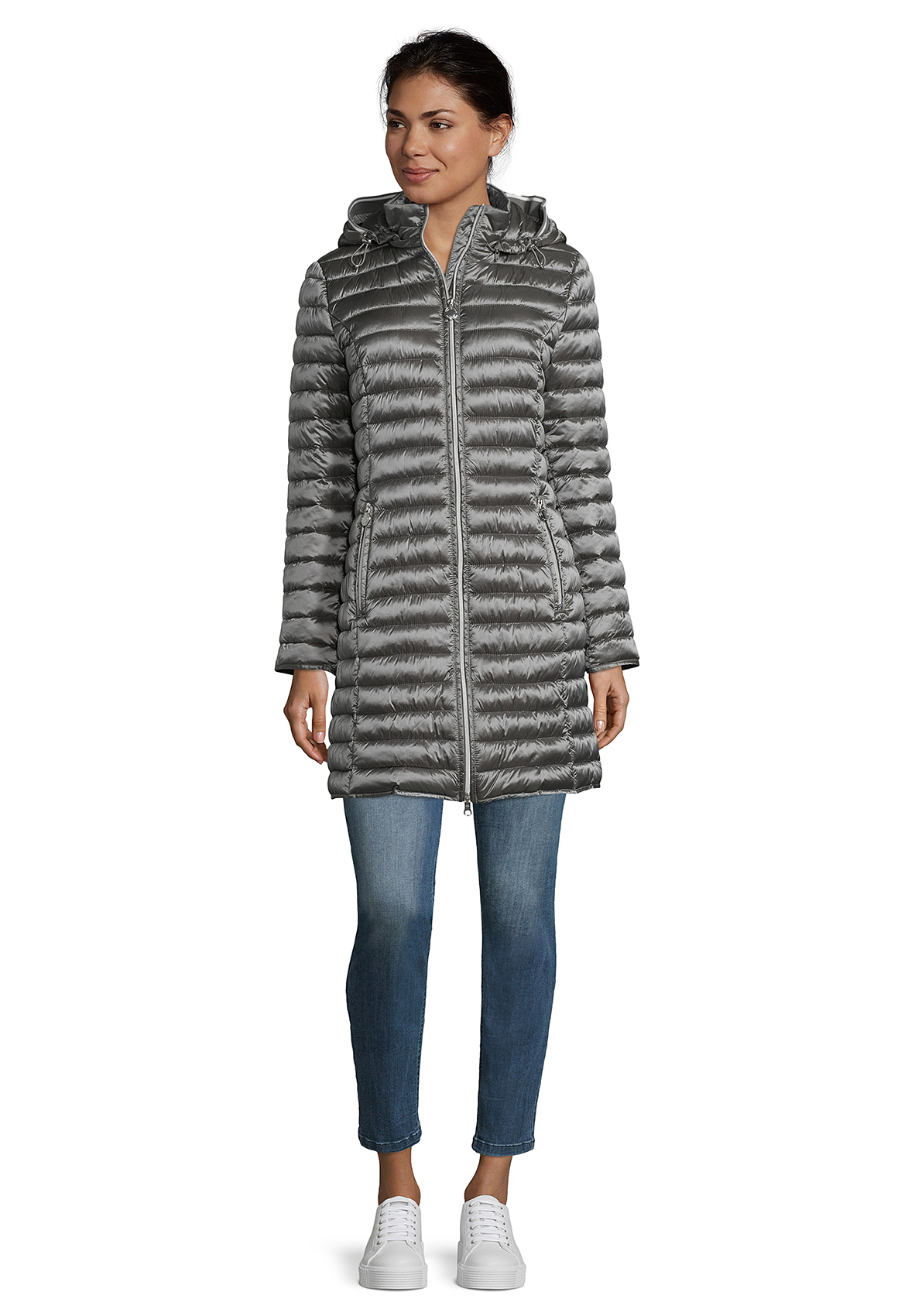 Пальто на облегченном синтепоне. Слегка приталенный силуэт, удобная длина до середины бедра, практичный воротник-стойка, капюшон на кулиске, двойная застежка-молния, карманы на молниях. Материал верха отлично защищает от ветра и влаги.