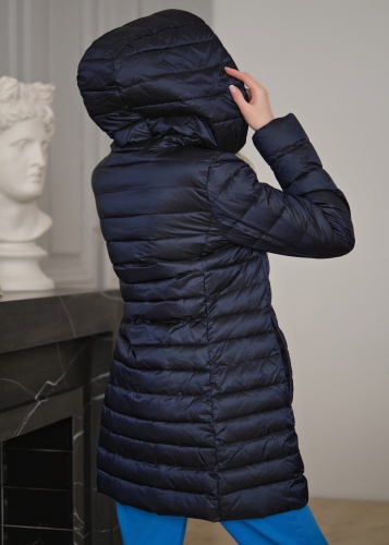 Стеганая однотонная куртка длиной до середины бедра. Глубокий капюшон, боковые карманы на молнии, втачной рукав полной длины. Представлена в синем и серебристом цвете.