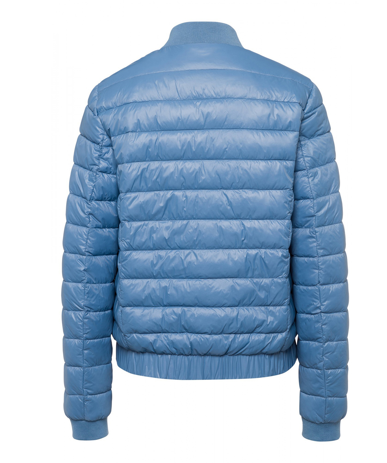 Куртка бомбер небесно голубого цвета станет частью как романтичного, так и спортивного образа. Втачной рукав полной длины с манжетой, воротник-стойка, врезные боковые карманы с листочкой.
