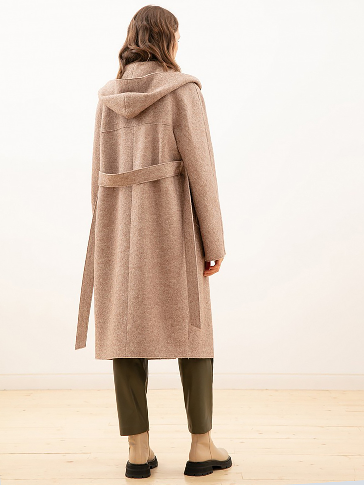 Пальто-халат с объемным капюшоном. Базовый коричневый оттенок, свободный крой подходит для любого типа фигуры. Застежка на пуговицы, в комплекте идет пояс из основного материала изделия. Шерсть в составе делает материал мягким, приятным на ощупь и хорошо сохраняющим тепло.