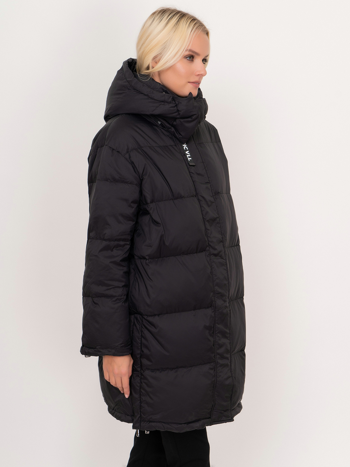 Стеганое однотонное пальто с пуховым наполнителем. Застежка на двойную молнию, ветрозащитная планка со скрытыми кнопками. Объемный капюшон, воротник стойка. Стильный базовый вариант пуховика, хорошо сочетается с различными нарядами.