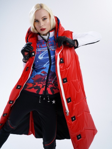 Удлиненный стеганый жилет ярко-красного цвета – теплый и стильный элемент аутфита. Подойдет для образов в спортивном или повседневном стиле, а также для образов спорт-шик. Застежка на контрастную молнию и клепки. Объемный капюшон защищает от ветра.