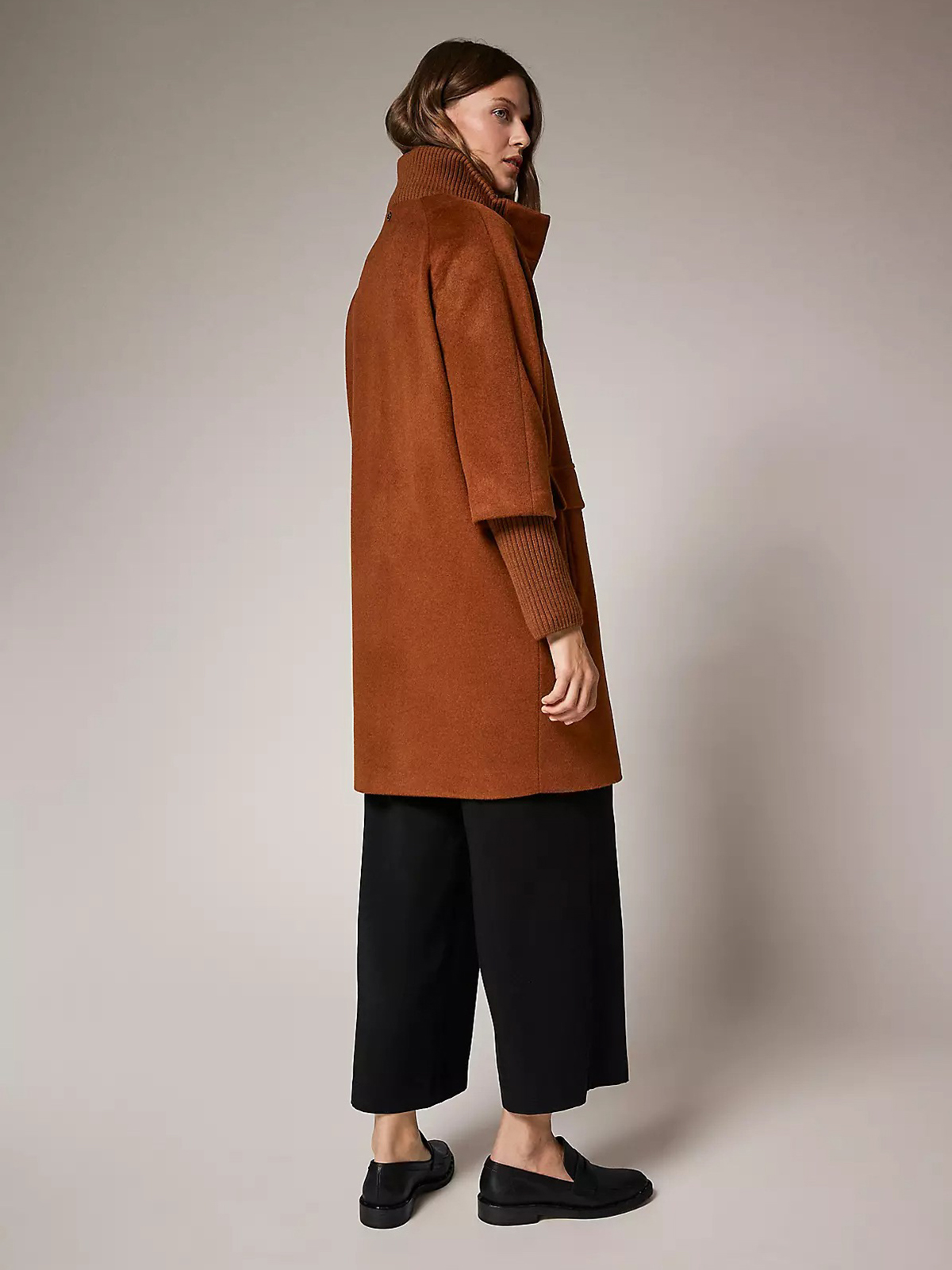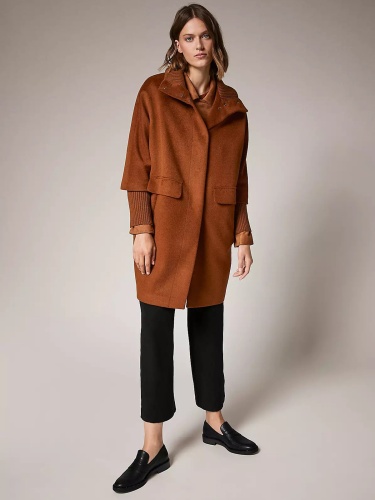 Однотонное драповое демисезонное пальто коричневого оттенка. Материал из смесовой шерсти. Супатная застежка на кнопки. Длинные втачные рукава с широкими трикотажными манжетами в рубчик. Высокий воротник стойка в рубчик. Боковые карманы с клапанами.
