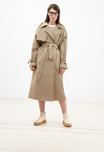 Двубортный тренч прямого силуэта из плащевой ткани бежевого цвета. Классический крой и длина миди делают эту модель универсальным дополнением образов в любом стиле. Рукав рубашечный, английский воротник, с возможностью застегивания на верхнюю пуговицу,чтобы закрыть зону декольте и не только изменить образ, но и предотвратить попадание ветра
