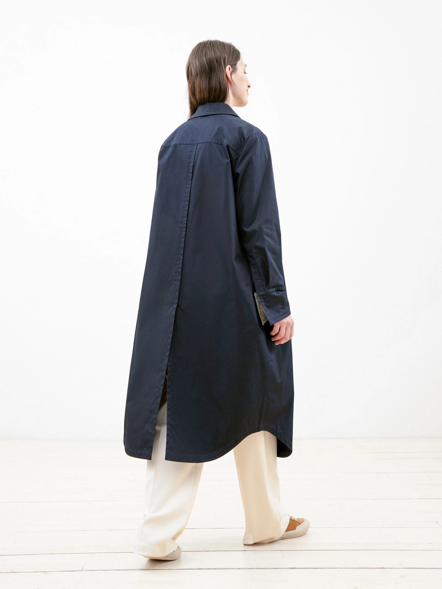 Плащ прямого силуэта из непромокаемой ткани темно-синего цвета. Аккуратный отложной воротник, классический втачной рукав. Низ рукава обработан широкой манжетой с застежкой на пуговицу. Изнаночная сторона манжеты имеет контрастную обработку для возможности отворота. Застежка супатная на ряд крупных пуговиц и одну роговую пуговицу для фиксации воротника. Длина плаща ниже колена, фигурный низ.