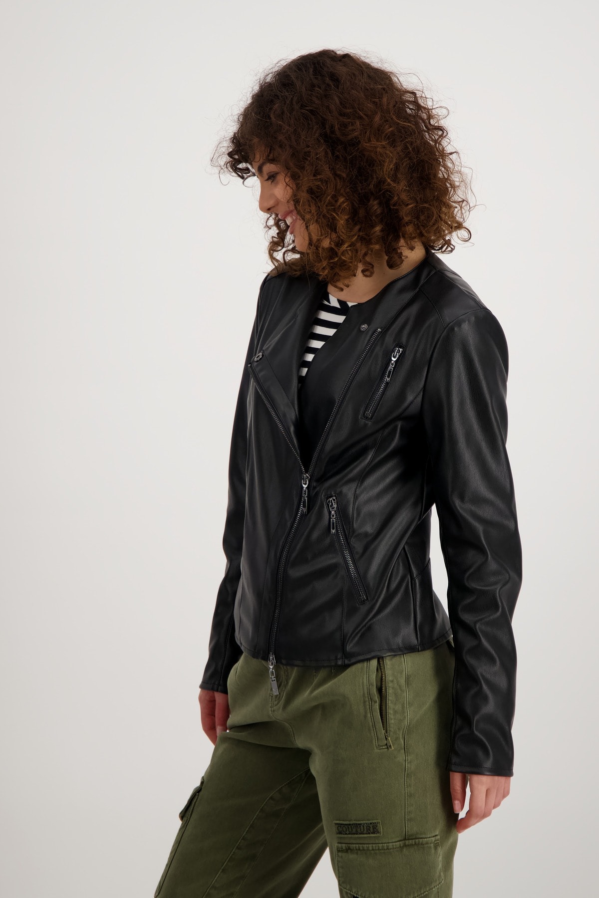 На сайте указаны российские размеры. Куртка в байкерском стиле из мягкой искусственной кожи с длинными рукавами. Прямой крой с круглым вырезом. Куртка украшена продольными разделительными швами на рукавах, переде и спинке, швами «принцесса» и плечевыми кокетками. Концы рукавов отделаны разрезом и молнией, а передняя часть имеет двустороннюю смещенную молнию, боковые прорезные карманы на молнии и дополнительный ложный карман на молнии на уровне груди. Рост модели 174 см Длина по спинке 44 размера составляет 58 см, а по переду – 74 см.