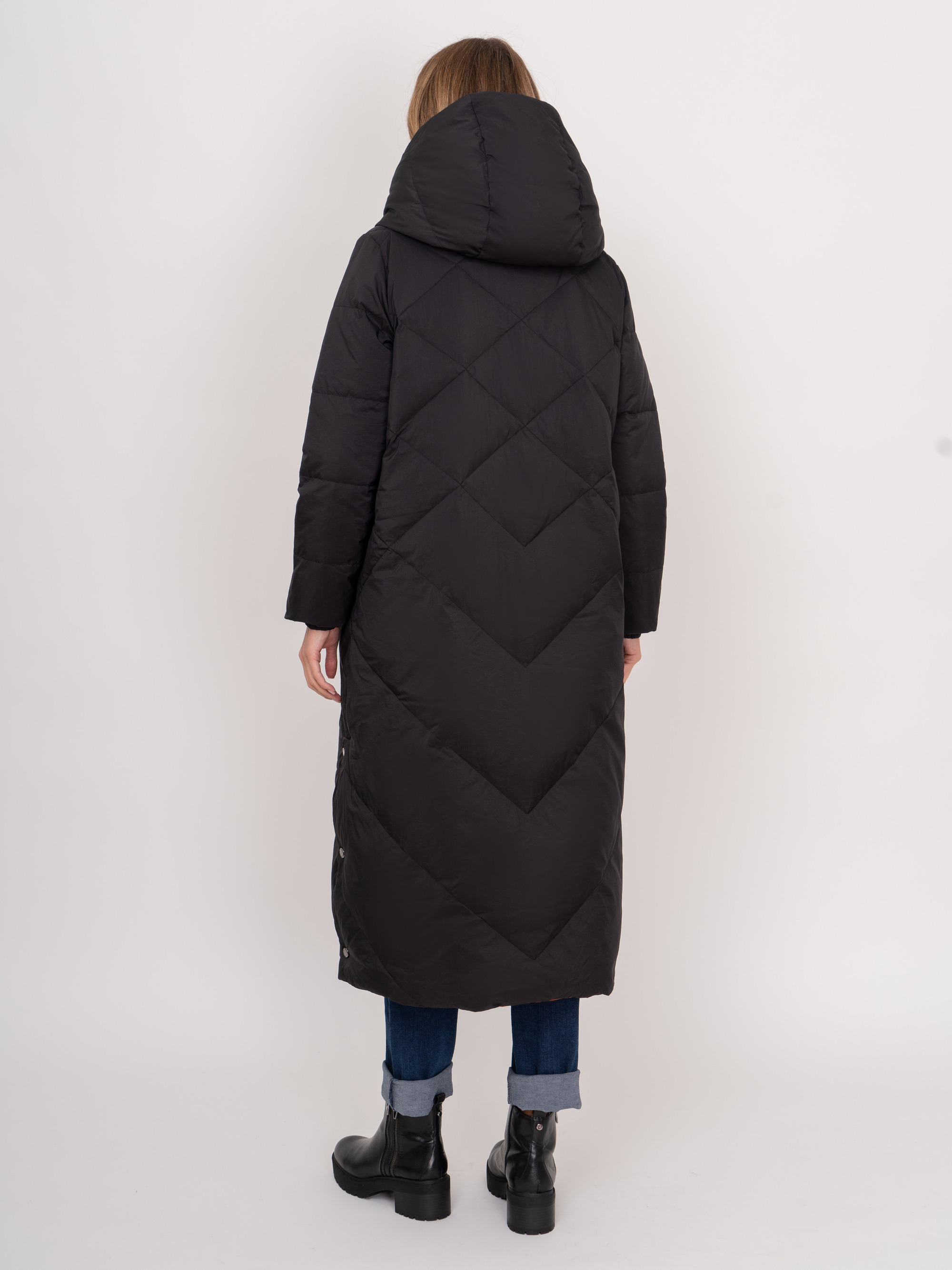 На сайте указаны российские размеры. Двустороннее утепленное черно-терракотовое пальто на молнии и кнопках, с длинным рукавом, с прорезными карманами, с трикотажными манжетами, с боковыми разрезами на кнопках. Рост модели: 175 см. Длина пальто: 119 см.
