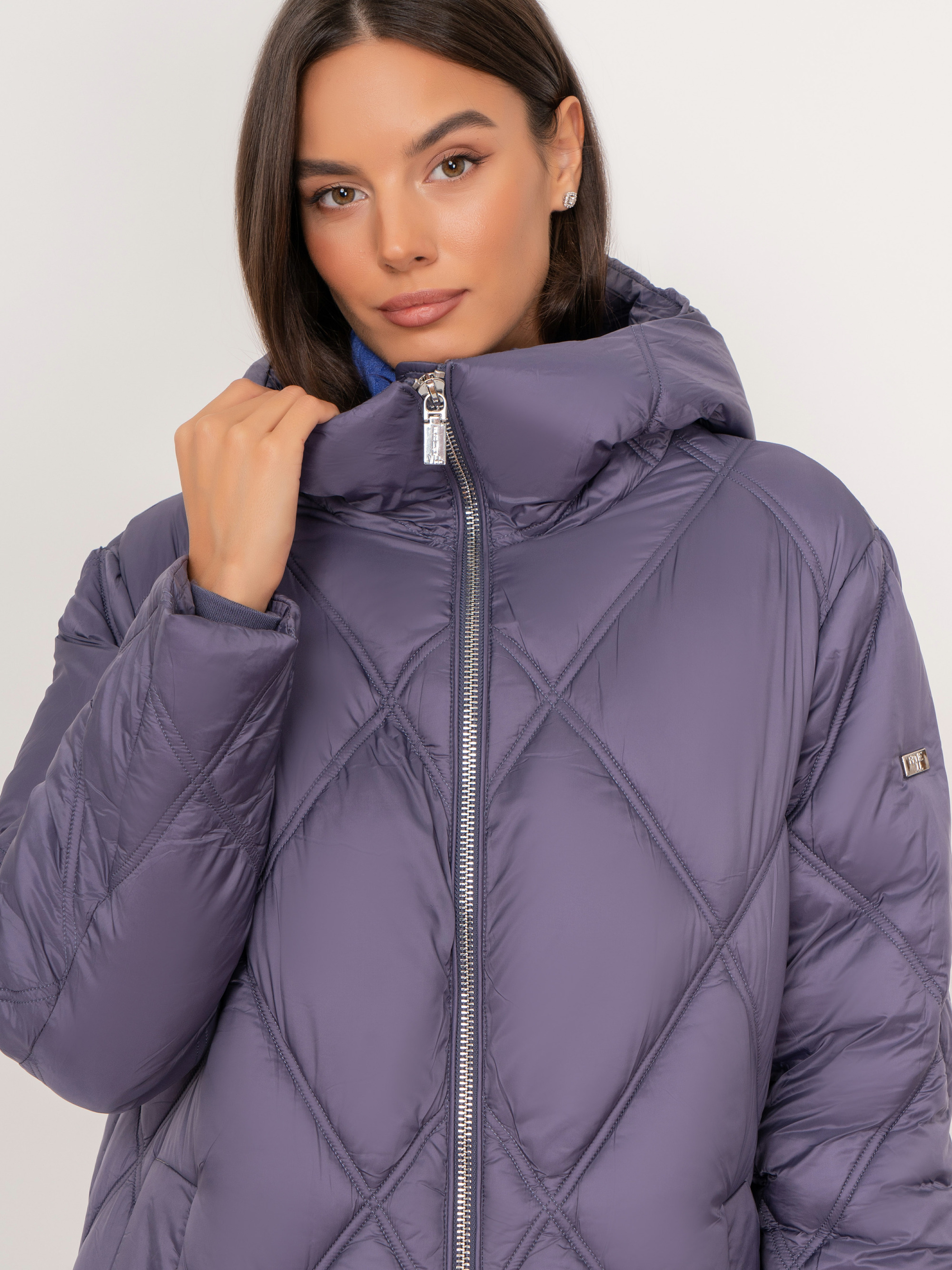 На сайте указаны российские размеры. Прямое стеганое утепленное фиолетовое пальто на молнии, с капюшоном, с длинным рукавом, с прорезными карманами на кнопках. Рост модели: 175 см. Длина куртки: 114 см.