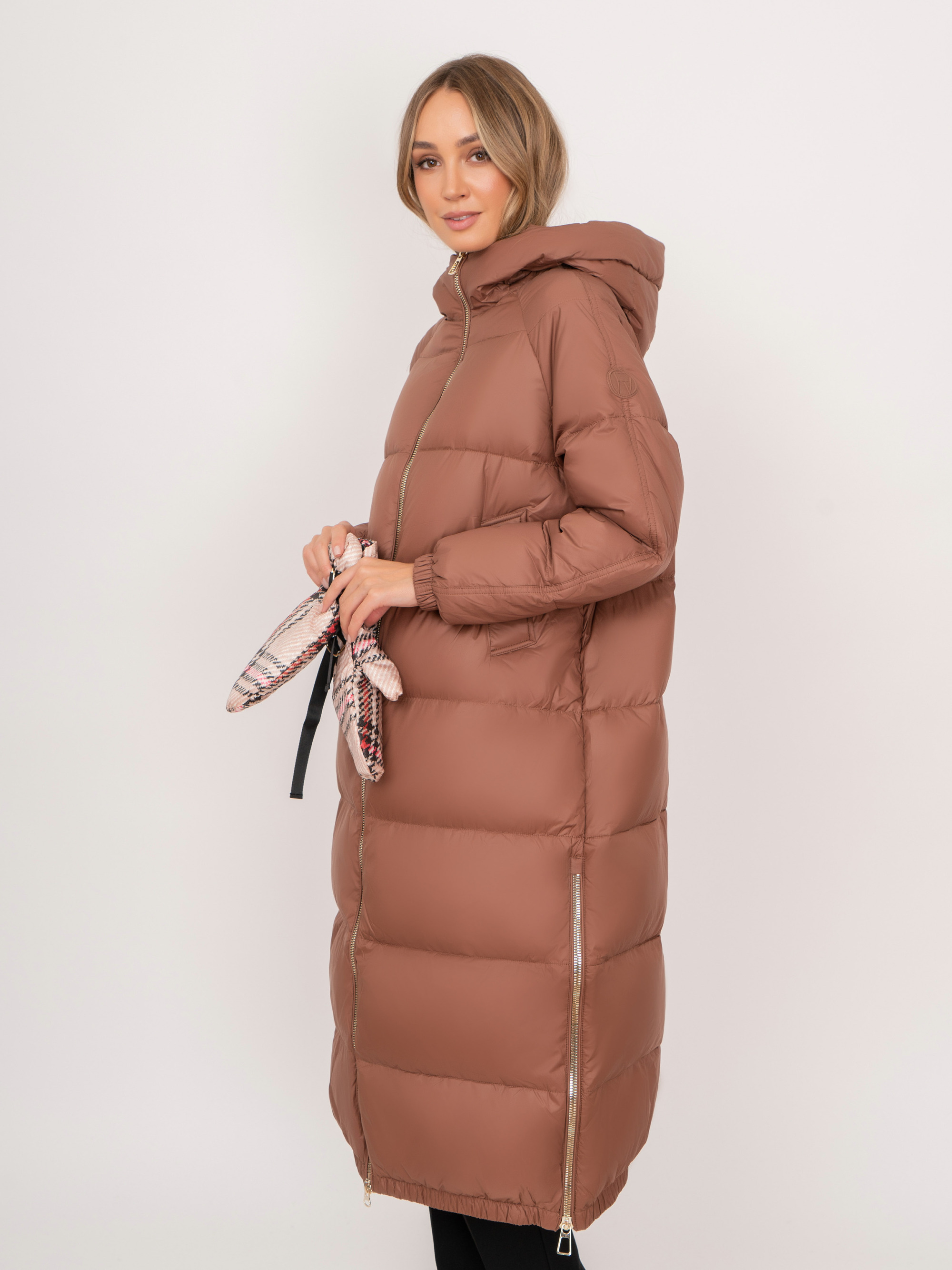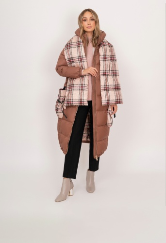 На сайте указаны российские размеры. Прямое утепленное пальто на молнии, с капюшоном, с прорезными карманами, с боковыми разрезами на молнии. В комплект входит дутый теплый бежевый шарф и варежки из плащевой ткани в яркую клетку. Длина по спинке: 115 см. Рост модели: 175 см.