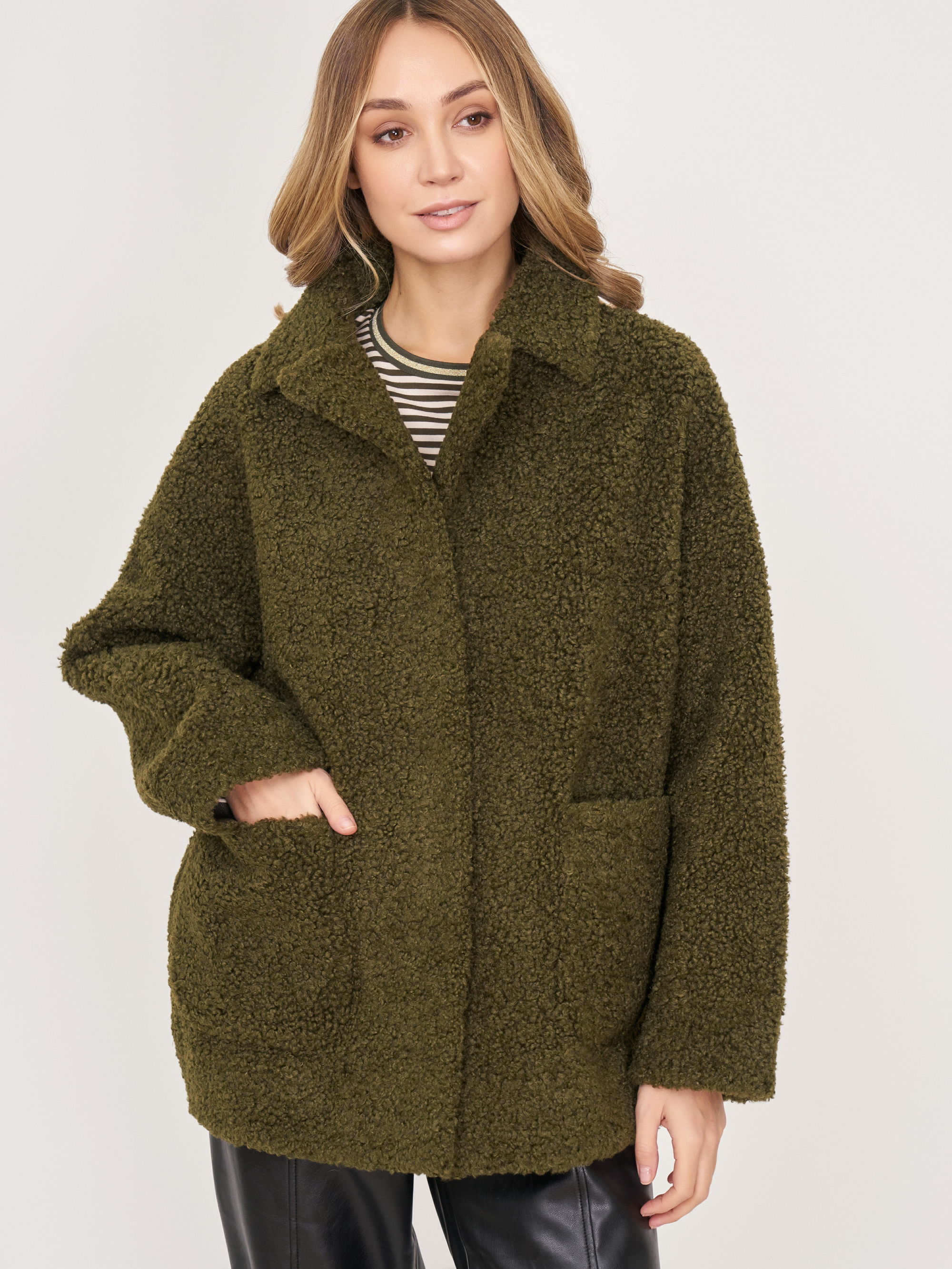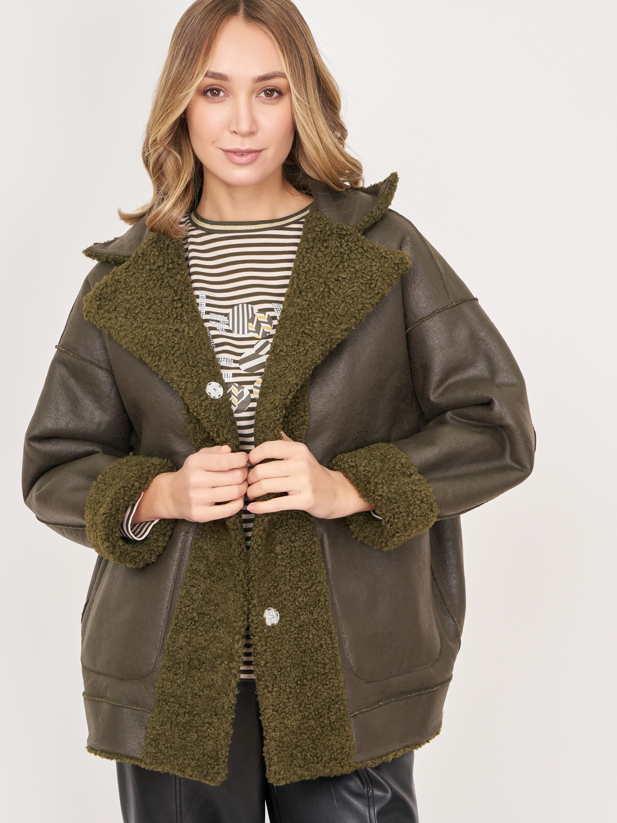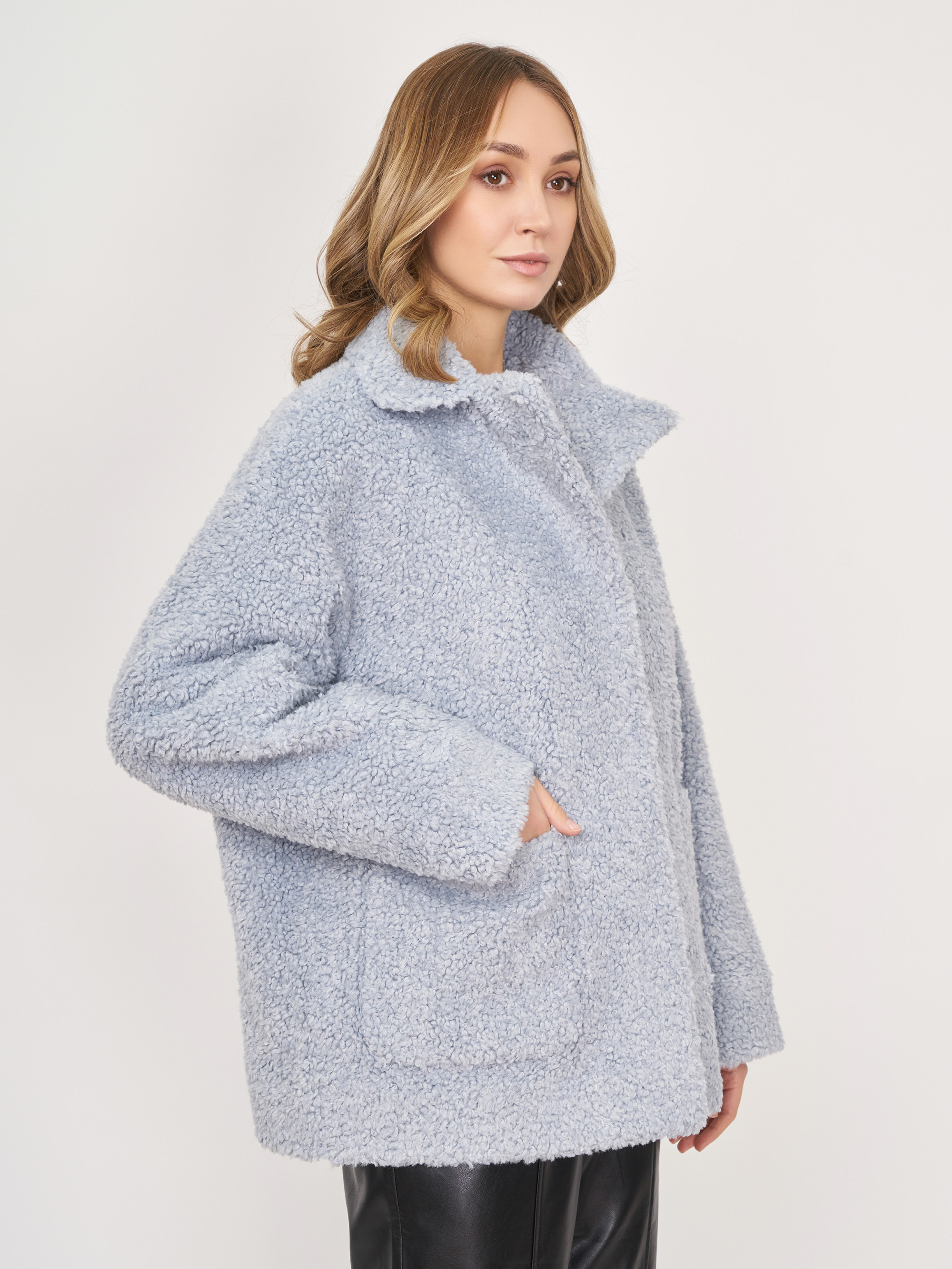 На сайте указаны российские размеры. Прямая двусторонная куртка из искусственного меха на кнопках, с отложным воротником, накладными карманами и с длинным рукавом. Представлена в голубом и хаки цветах. Длина по спинке: 70 см Рост модели: 175 см