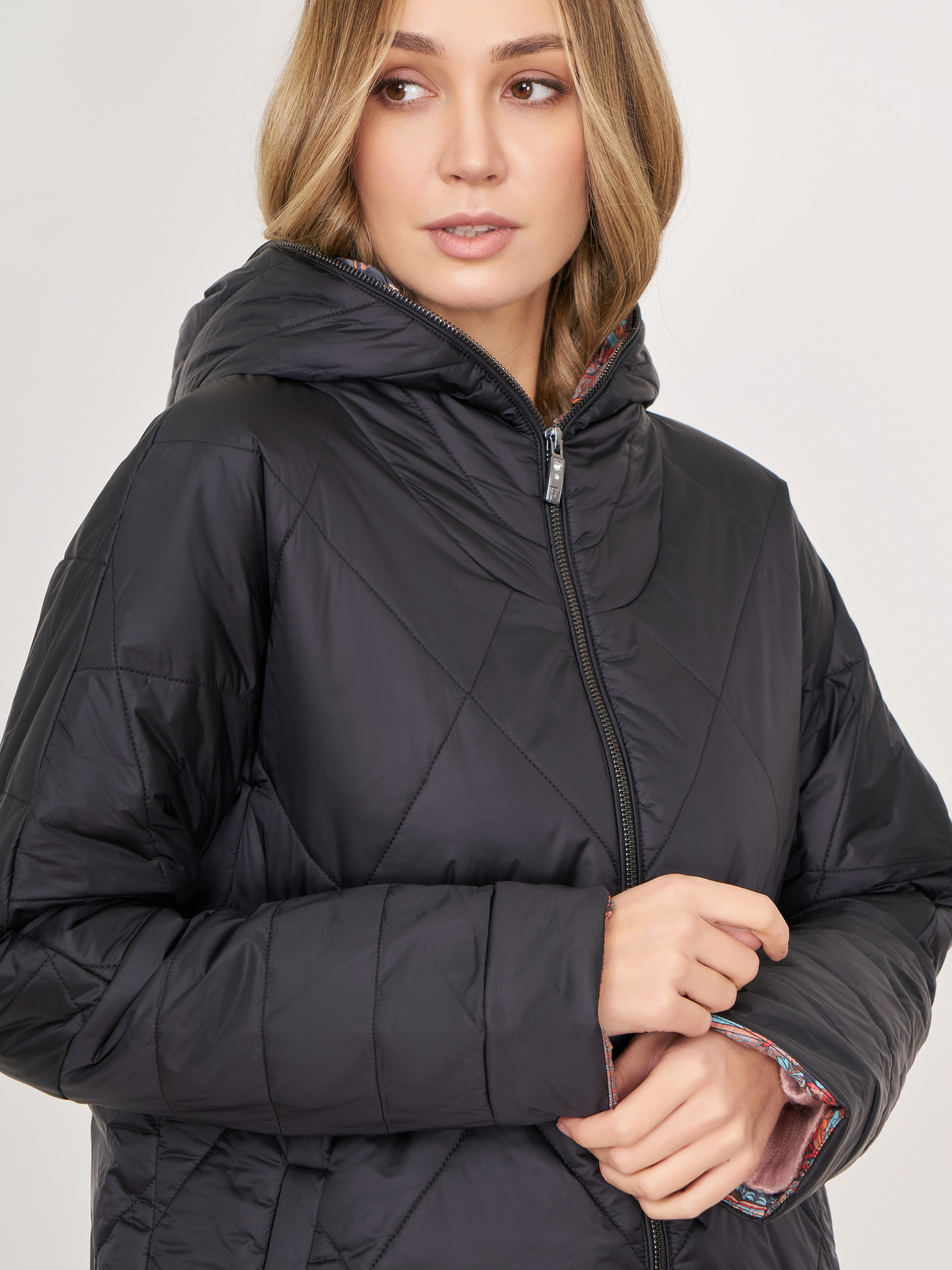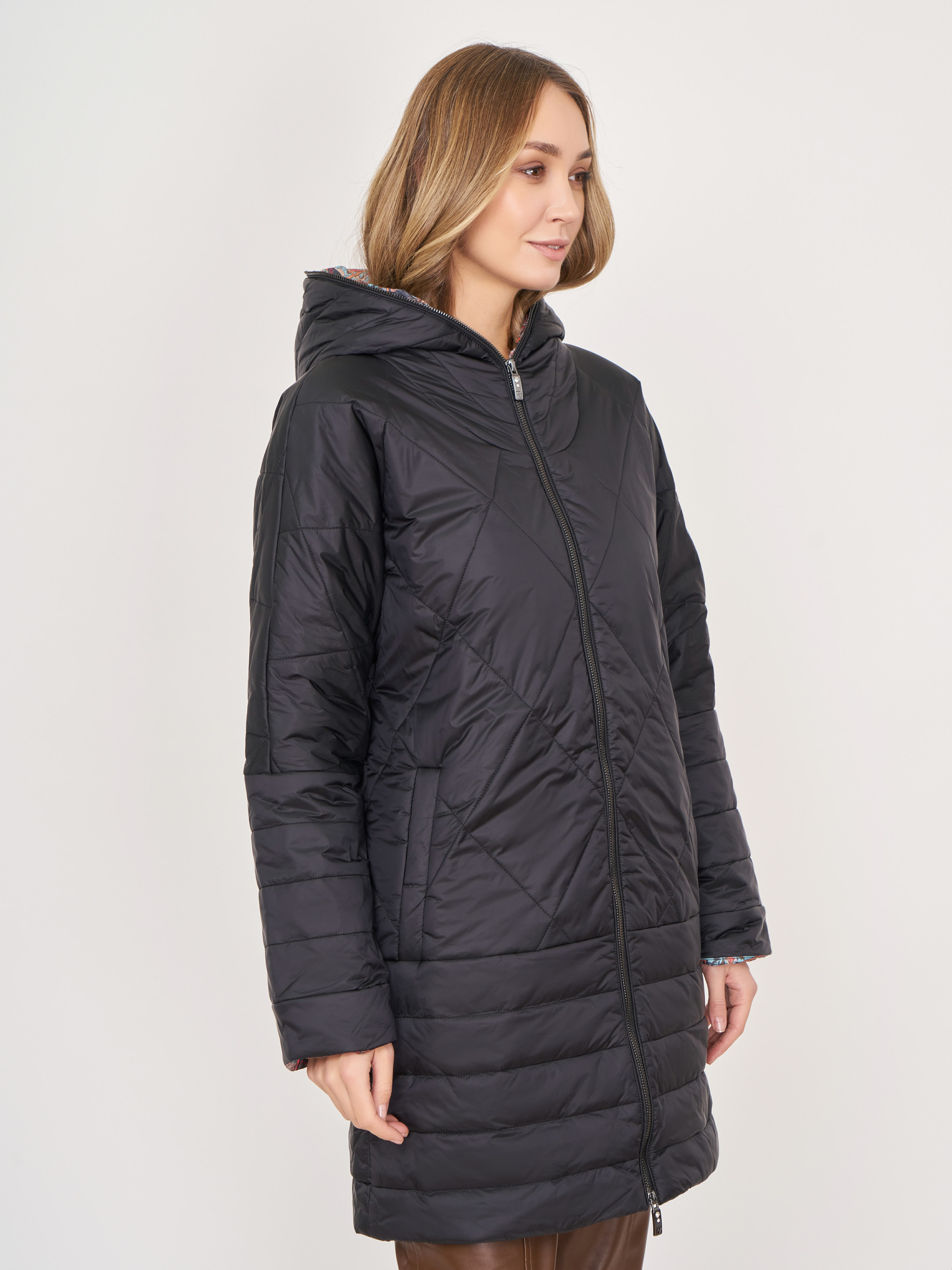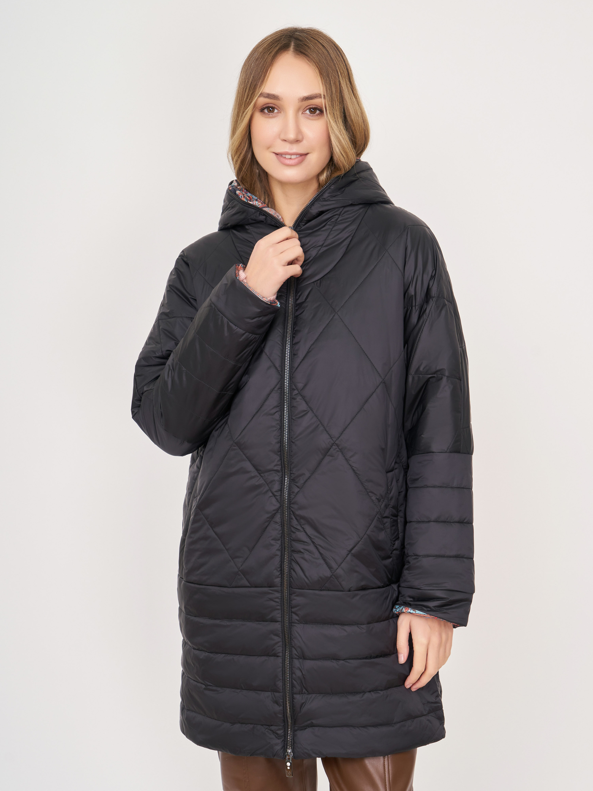 На сайте указаны российские размеры. Прямое стеганное черное утепленное пальто на молнии, с воротником-капюшоном, с длинным рукавом, с прорезными карманами на магнитной застежке. Длина по спинке: 85 см. Рост модели: 175 см.