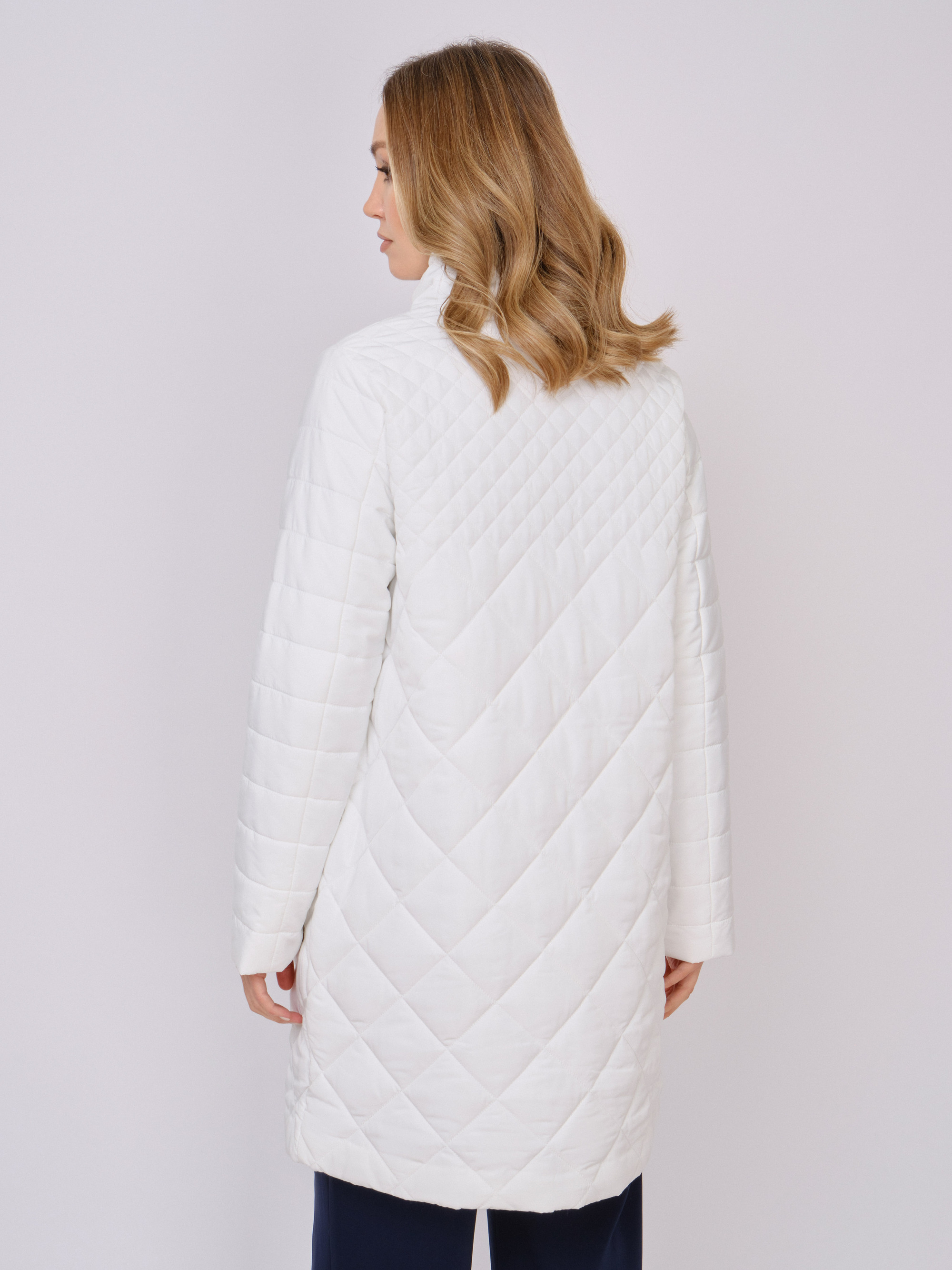 На сайте указаны российские размеры. Утепленное стеганое прямое белое полупальто на молнии, с длинным рукавом, с прорезными карманами на молнии. Длина по спинке: 90 см. Рост модели: 175 см.