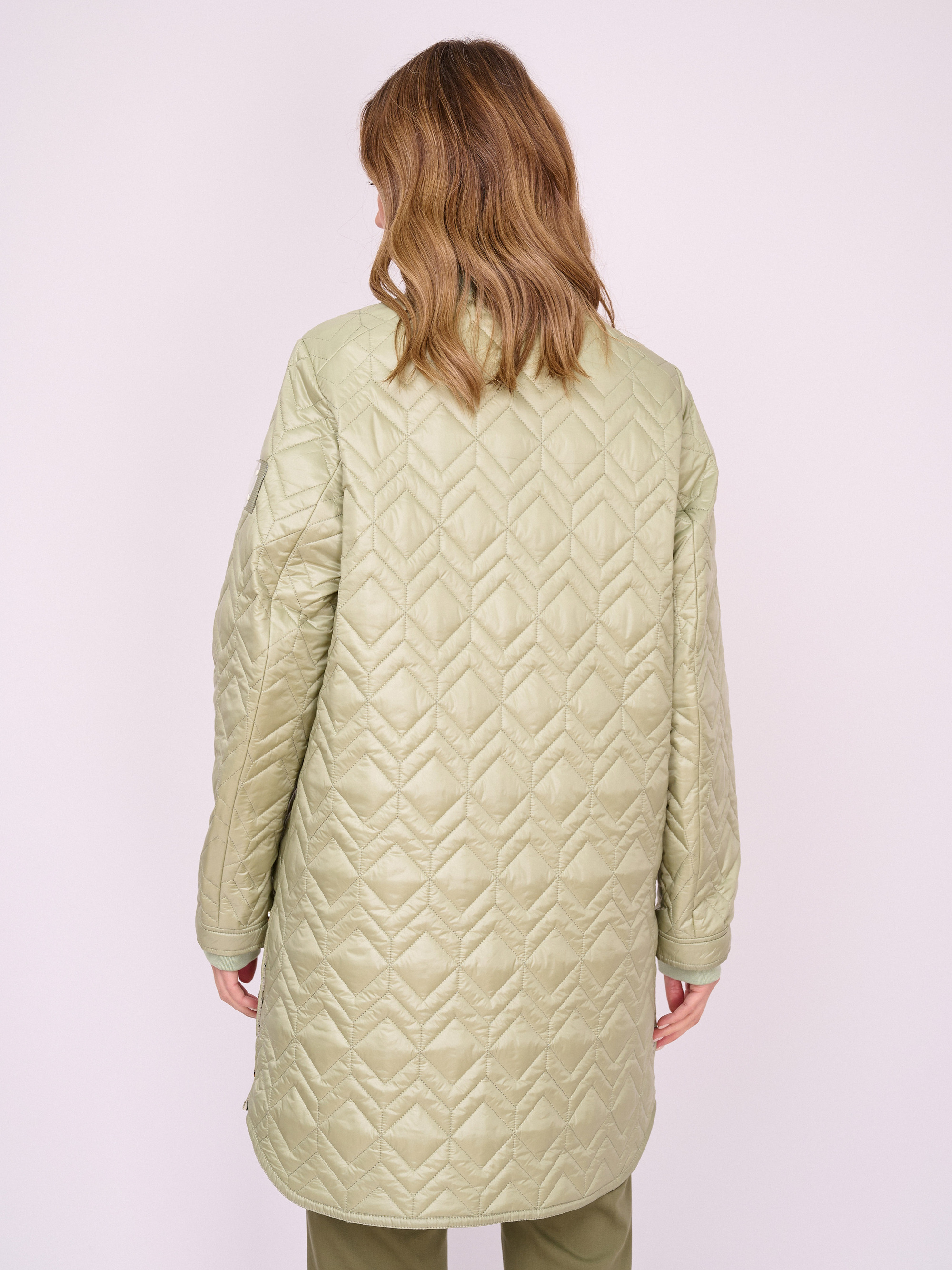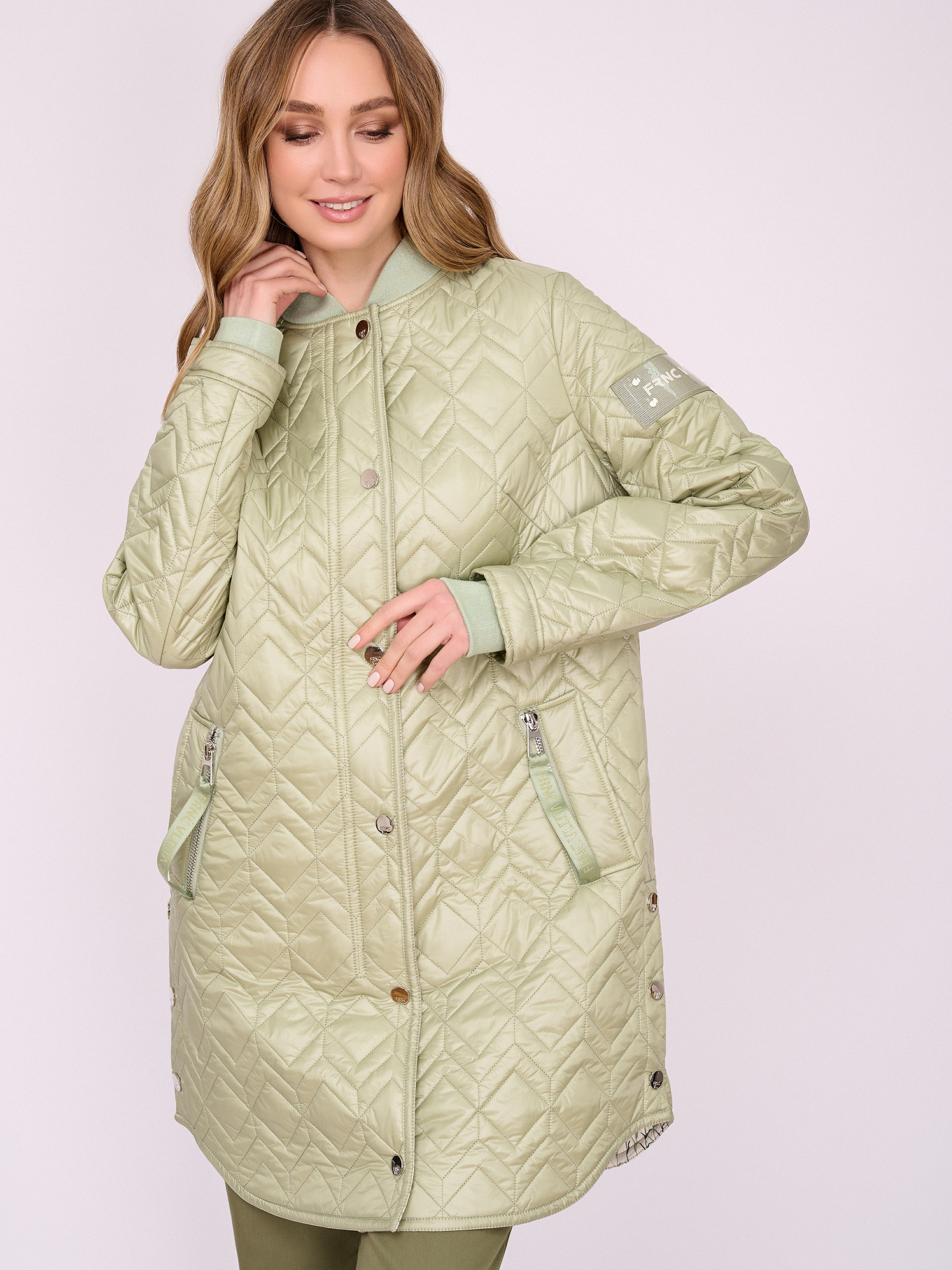 На сайте указаны российские размеры. Стеганное мятное пальто на молнии, с воротником-стойка, с длинным рукавом, с прорезными карманами на молнии, с боковыми разрезами на кнопках. Длина по спинке: 88 см. Рост модели: 175 см.