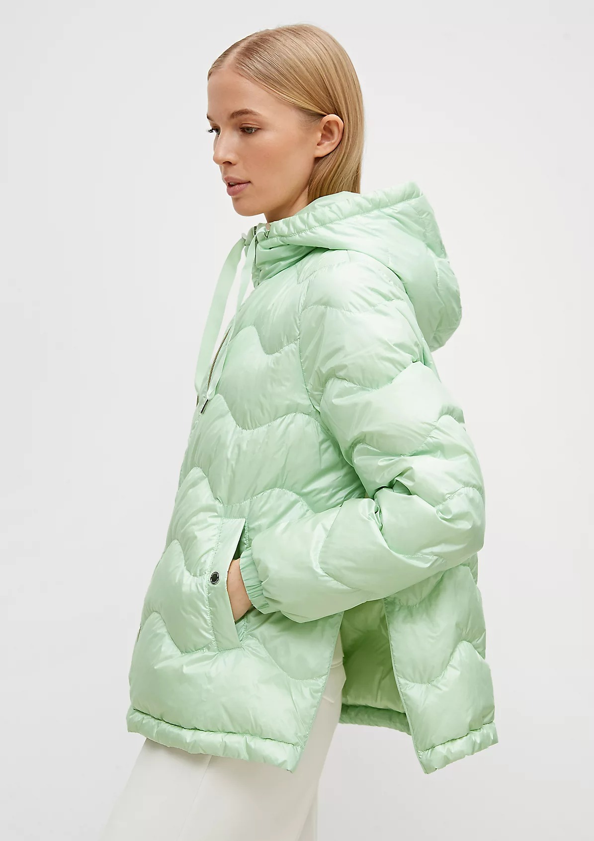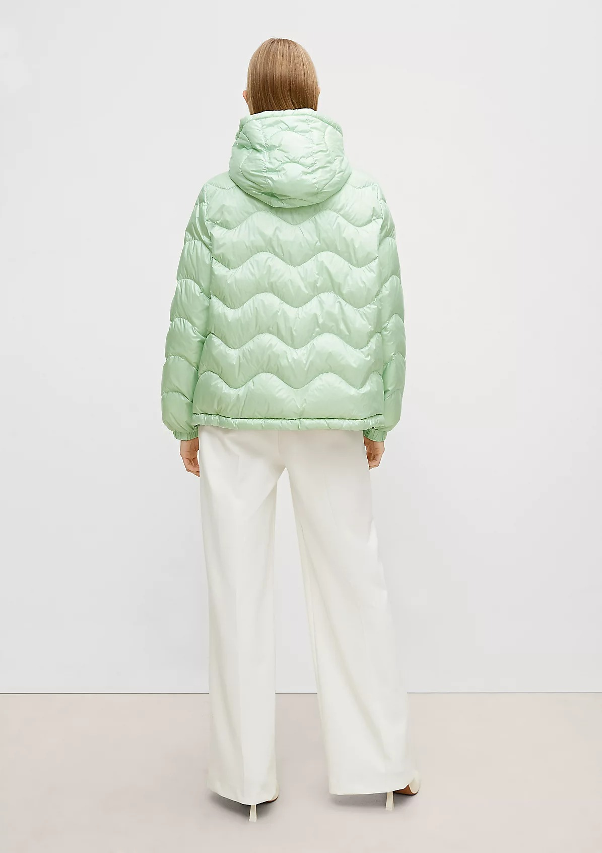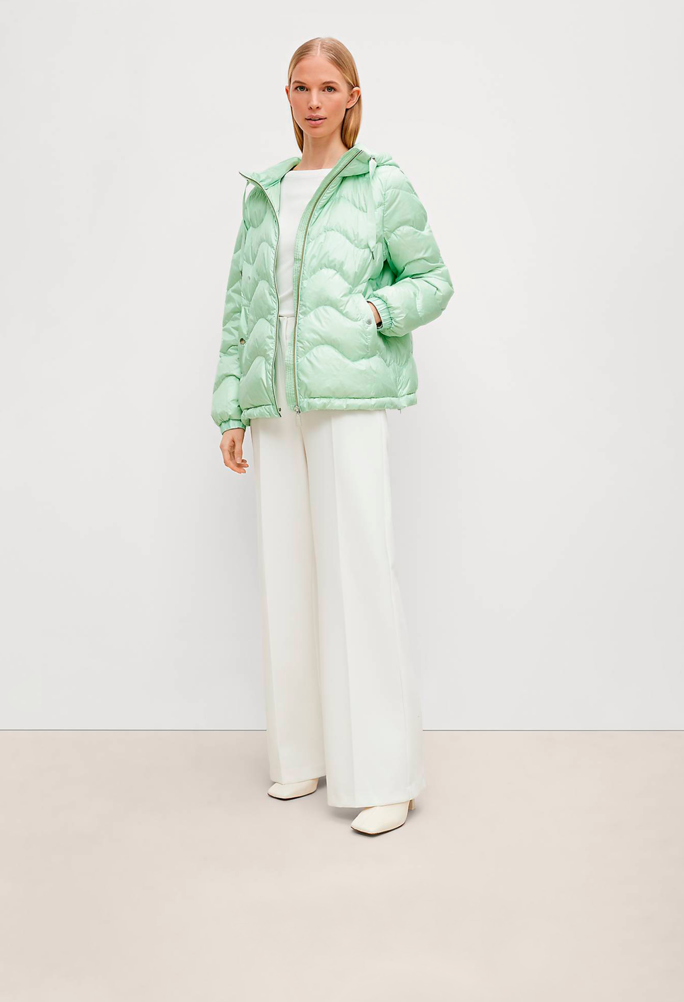 На сайте указаны российские размеры. Короткая куртка с капюшоном и стеганой отделкой. Подкладка: подкладка из тафты. Наполнитель: пух и перья. Длинные рукава, эластичные манжеты. Длина спины: 64 см в размере 42 Рост модели: 178 см