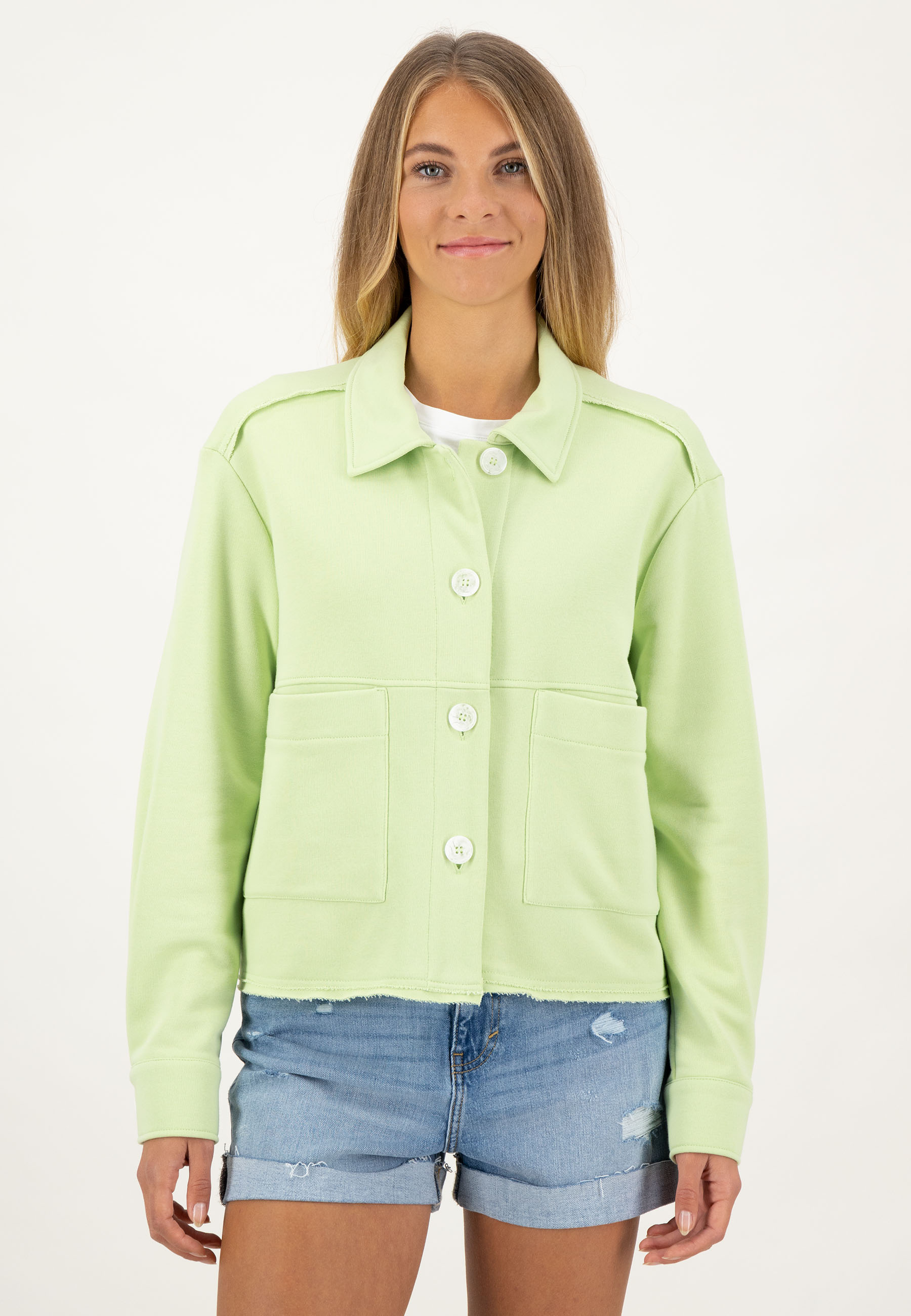 Жакет на пуговицах с разделительными швами и накладными карманами.