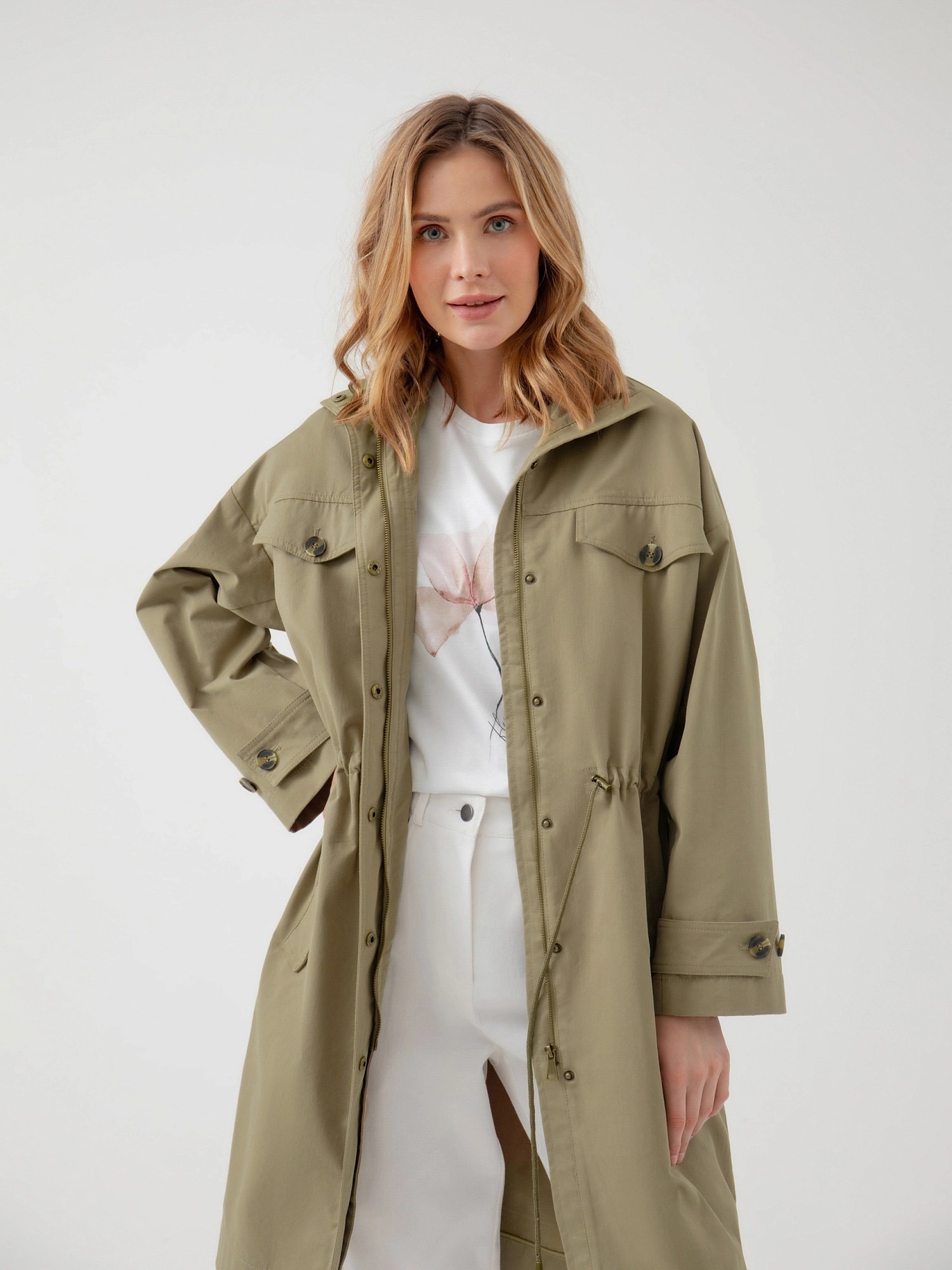На сайте указаны российские размеры. Плащ прямого силуэта из премиальной плащевой ткани в цвете "серебряный шалфей". Плащ имеет кофмортный воротник-стойку, который не только очень стильно выглядит, но и защищает от сильного ветра. В области талии плащ имеет кулиску со шнуром, который с легкостью регулирует посадку и делает силуэт как более прилегающим, так и свободным. Тренч имеет четыре кармана с клапанами, которые не только очень функциональные, но и служат дополнительным декором. Спущенный рубашечный рукав очень комфортный и дает возможность с легкостью надевать первым слоем более объемные вещи, не стесняя при этом движений. Длина изделия: 111 см. Рост модели 175 см.