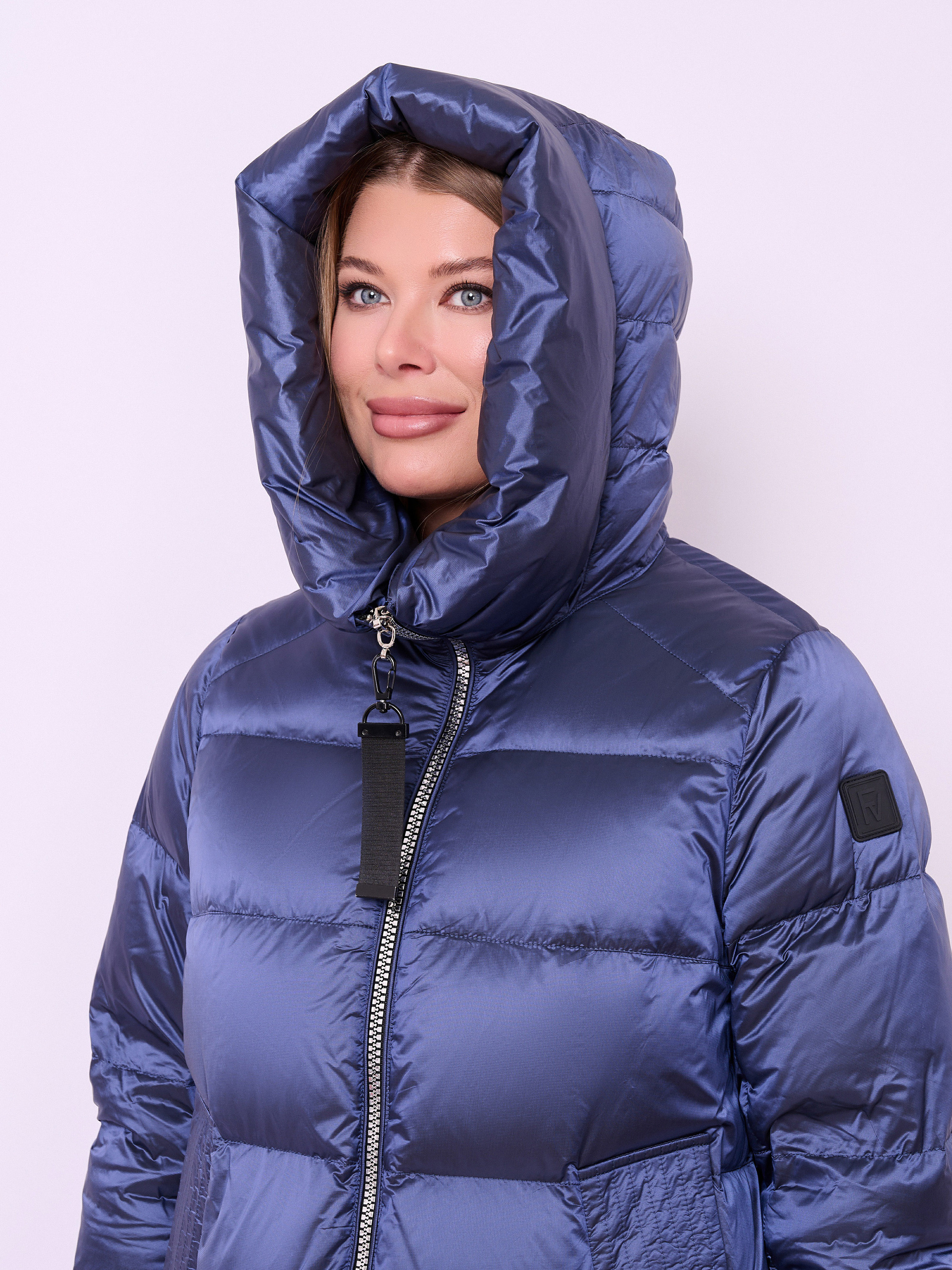 Пальто-пуховик стеганое с высоким воротом, несъемным капюшоном на кулиске без опушки, с длинными рукавами на резинке, прорезными карманами на магнитной кнопке, высокими разрезами на молнии и низом на резинке. Длина по спине: 112 см