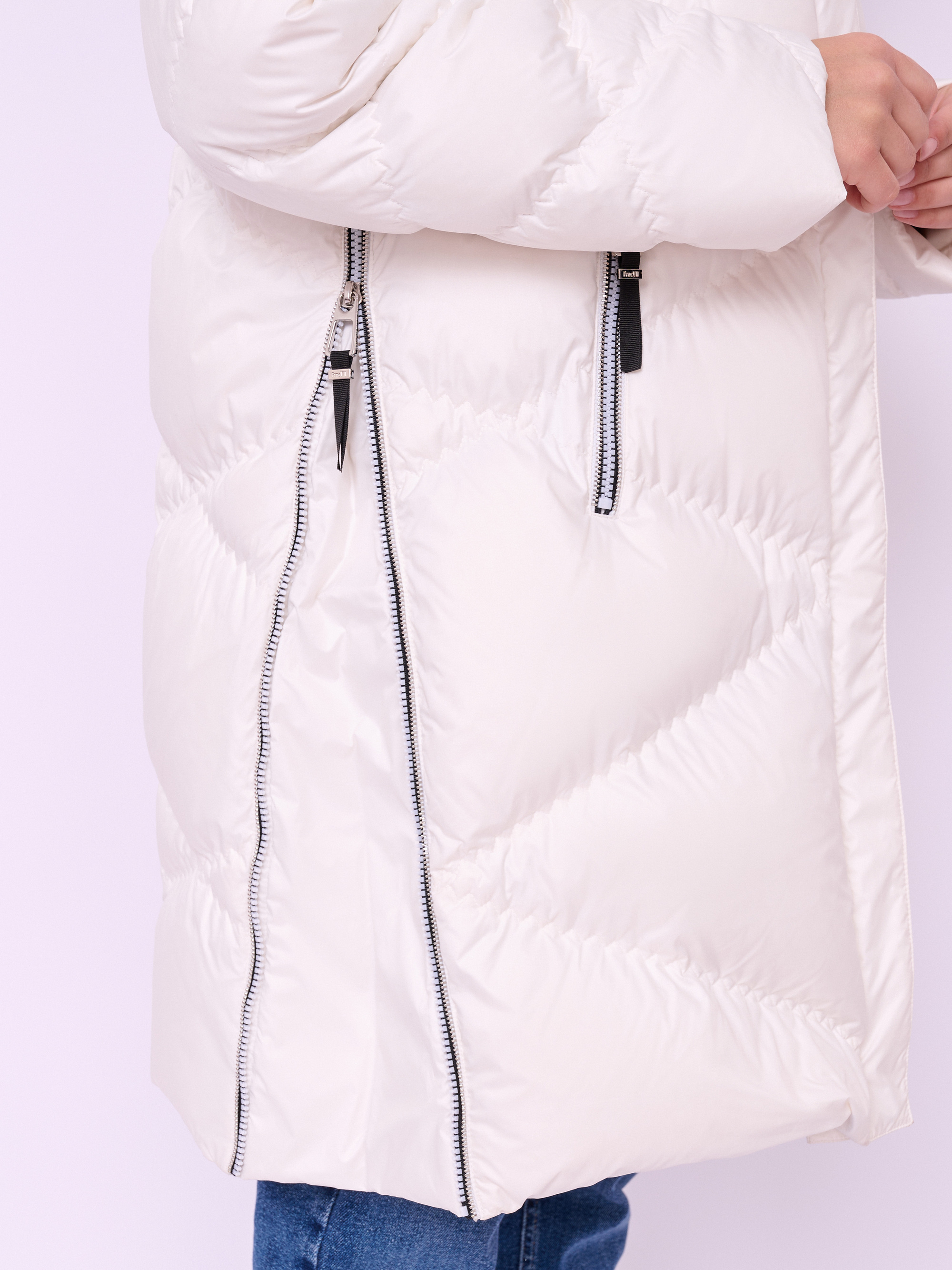 Стеганая куртка-пуховик на молнии и кнопках с высоким воротом, несъемным капюшоном со съемной опушкой из меха енота, длинными рукавами-реглан, прорезными карманами на молнии и высокими боковыми разрезами на молнии. Длина по спинке: 92 см.