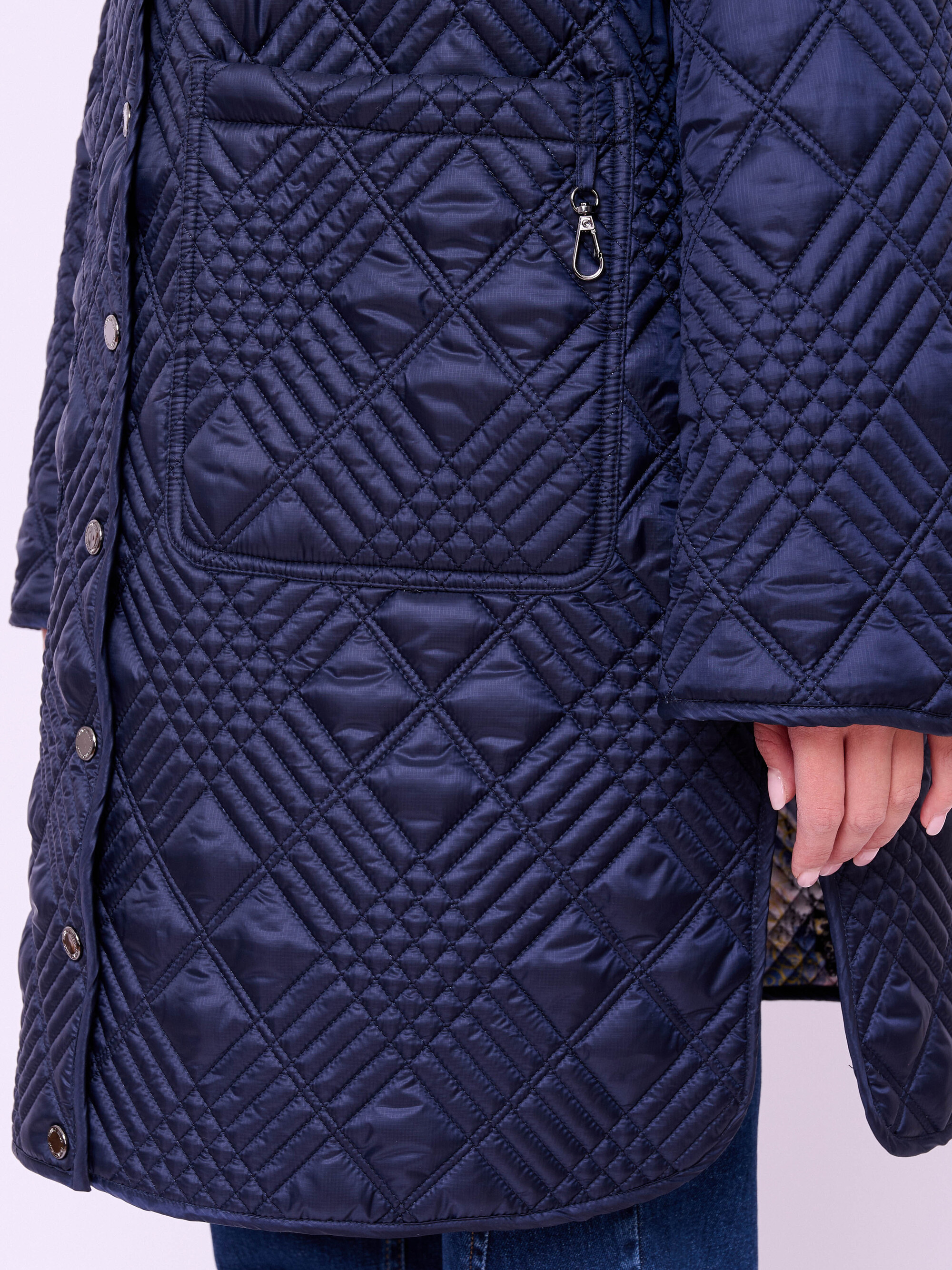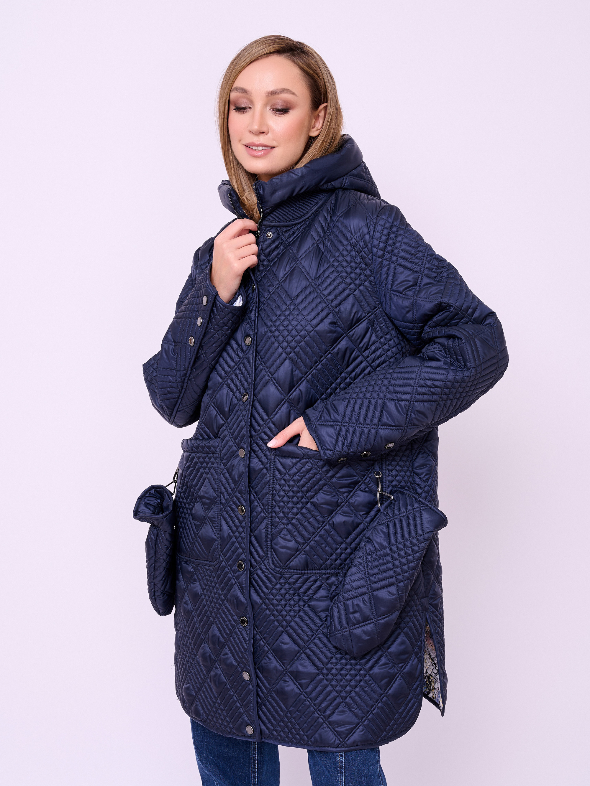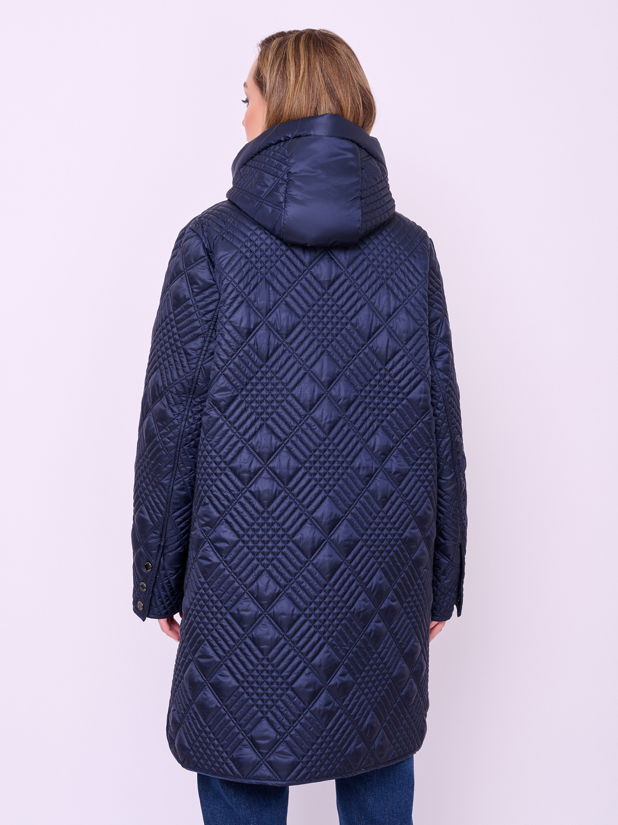 Утепленное стеганое пальто прямого покроя средней длины с воротником-стойкой, съемным капюшоном-манишкой, длинными рукавами на кнопках, накладынми карманами и рукавицами из основного материала. Длина по спинке: 92 см
