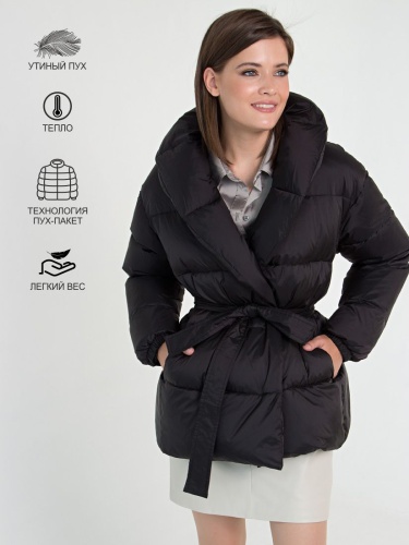 Куртка женская с поясом, выполнена из мягкой ткани с внутренним свечением. Объемный силуэт с акцентной линией плеч и шалевыми лацканами помогает произвести впечатление. С помощью потайной пуговицы, ворот удобно прилегает к шее, защищая от ветра. Центральная застежка двубортная на кнопки, боковые прорезные карманы застегиваются на молнию. Длина: 76 см.