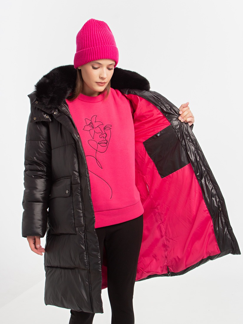 Парка свободного силуэта с накладными карманами из модного нейлона с деликатным блеском. В этой куртке будет комфортно во время прогулки при температуре до -25 градусов. Куртка выполнена по эко технологиям- утеплитель био-пух для этого изделия получили из 15 переработанных пластиковых бутылок, уютный сьемный воротник – экомех, имитирующий песца. Для комфорта сделаны эластичные внутренние манжеты и утепленные двойные карманы, съемный капюшон, противоветровая планка спереди. Модель выполнена в двух расцветках – черный с подкладкой фуксия и кофейный с подкладкой в тон верха. Воротник из экомеха в тон верхней ткани. Длина: 98 см. Утеплитель: 290 грамм/м2