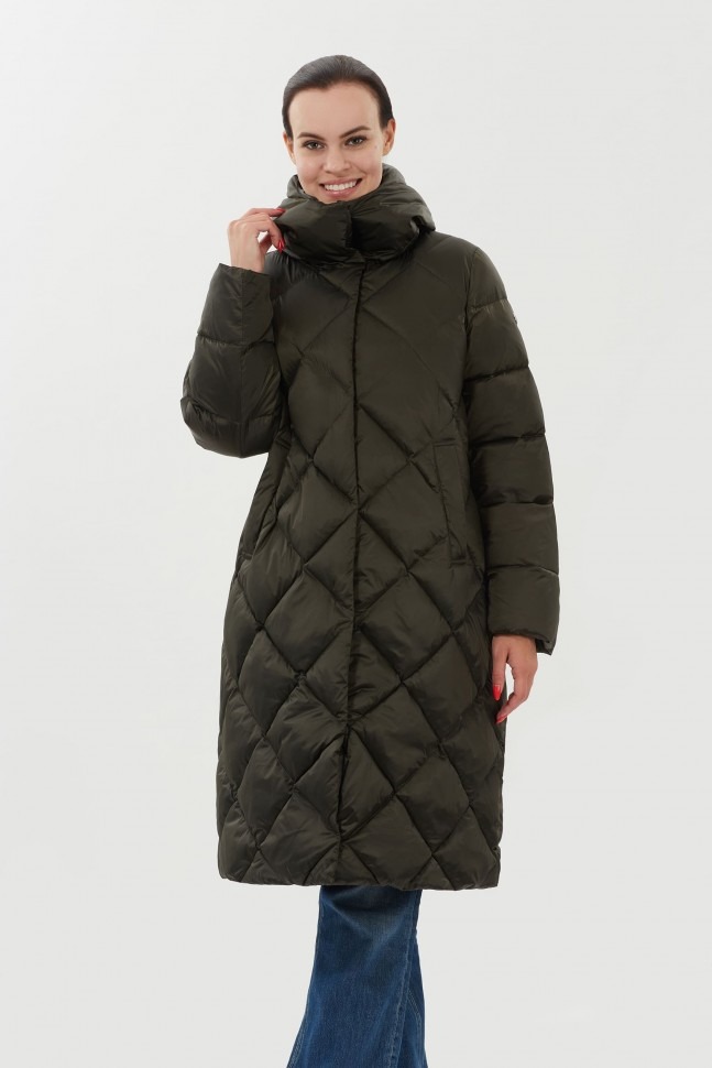 Пальто женское прямого силуэта. Выполнено из водоотталкивающей ткани с эффектом металлик. Застежка борта на молнии и потайных кнопках, закрытых планкой Карманы листочки, втачной капюшон, по низу рукава внутренний трикотажный манжет.