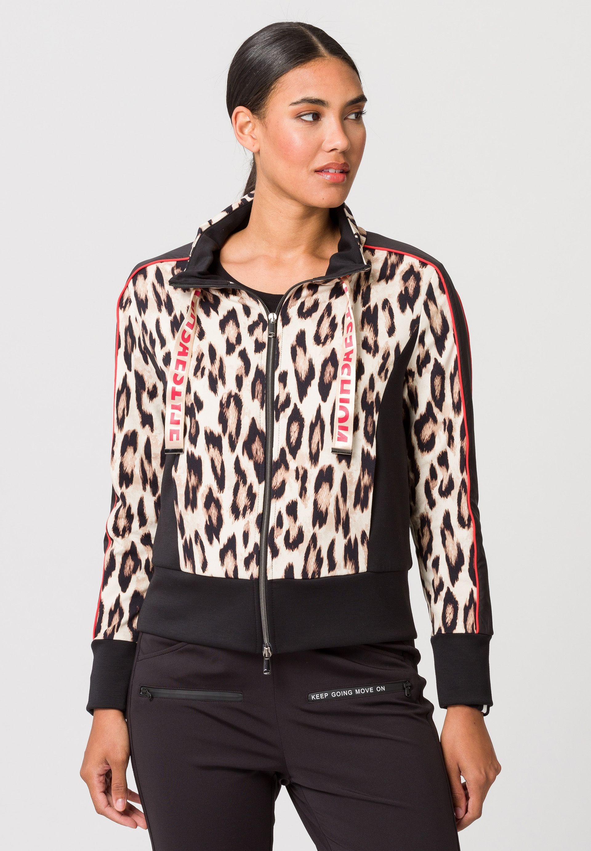 Легкая женская куртка с воротником стойкой и принтованными атласными лентами. Животные принты вряд ли когда-нибудь выйдут из моды, поэтому эта легкая куртка станет вечной модной классикой. Модный дизайн дополняется матовой блестящей тканью и контрастной окантовкой рукавов. Воротник-стойка выглядит стильно благодаря декоративным атласным лентам с принтом. Удобная куртка из джерси, которая подчеркнет спортивный, гламурный повседневный образ.