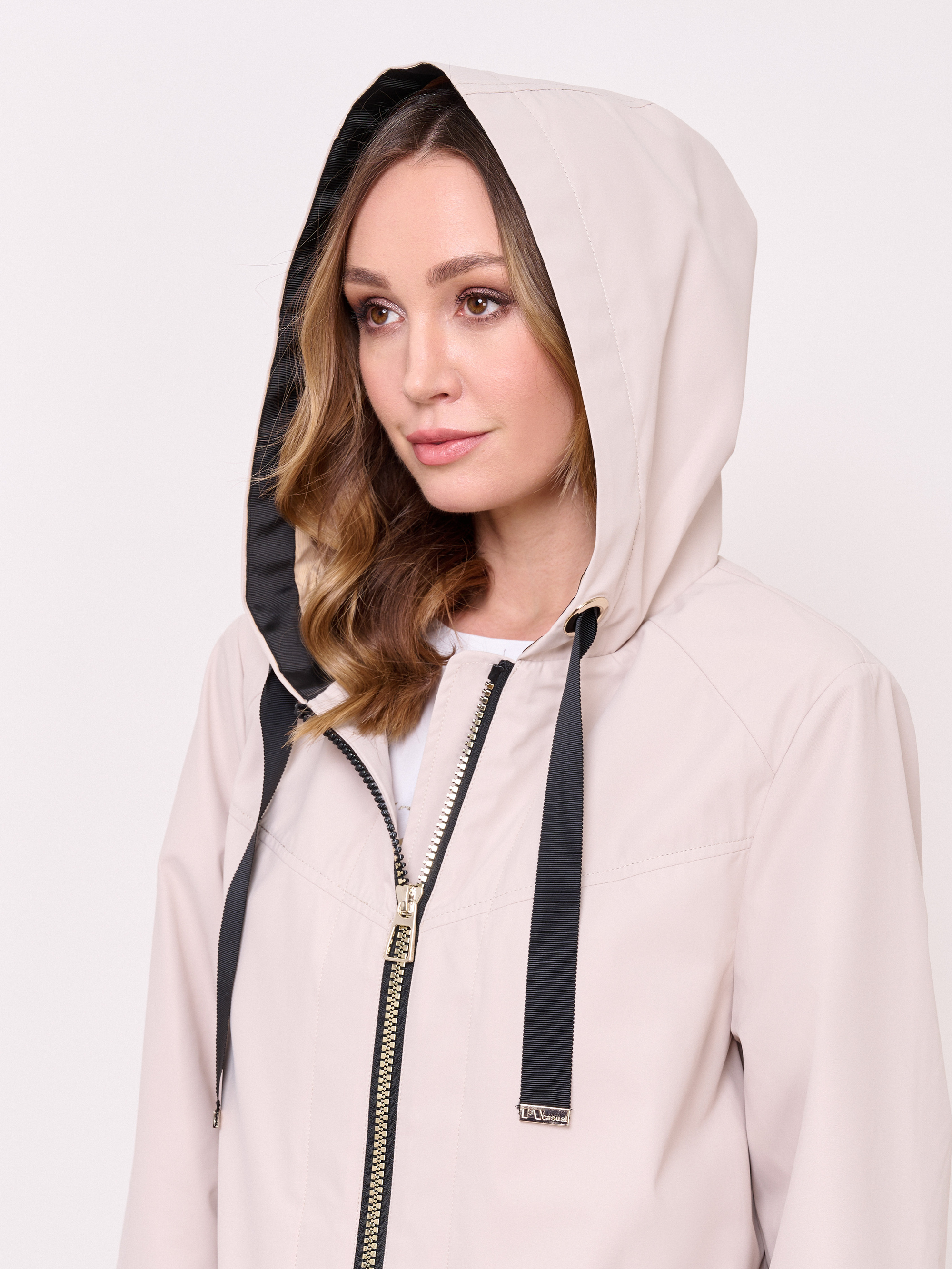 Застежка молния, несъемный капюшон с кулиской, рукава длинные с отворотами и хлястикамина кнопке, покрой прямой, без рисунка, без утепления, карманы прорезные, плотность утеплителя 0,01, без опушки, борты однобортное.
