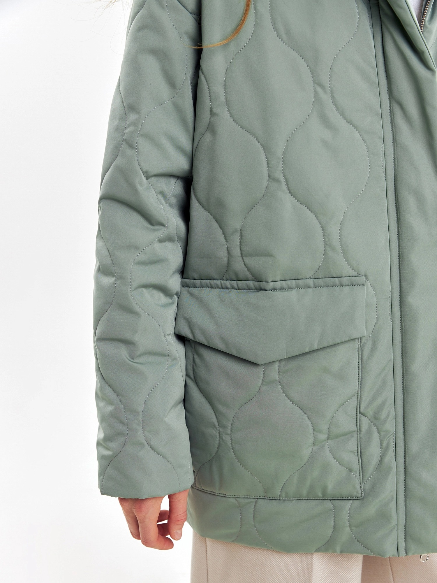 Короткая весенняя куртка из стеганой плащевой ткани в ультрамодном цвете "зеленый айсберг". Куртка имеет прямой силуэт, комфортный рубашечный рукав и высокий воротник-стойку. По бокам располагаются глубокие накладные карманы с клапанами. Застегивается изделие на молнию и установочные кнопки. В комплекте с курткой предлагается съемный капюшон с короткой манишкой. Капюшон, а также карманы и планка куртки выполнены из плащевой ткани-компаньона в цвете основной.