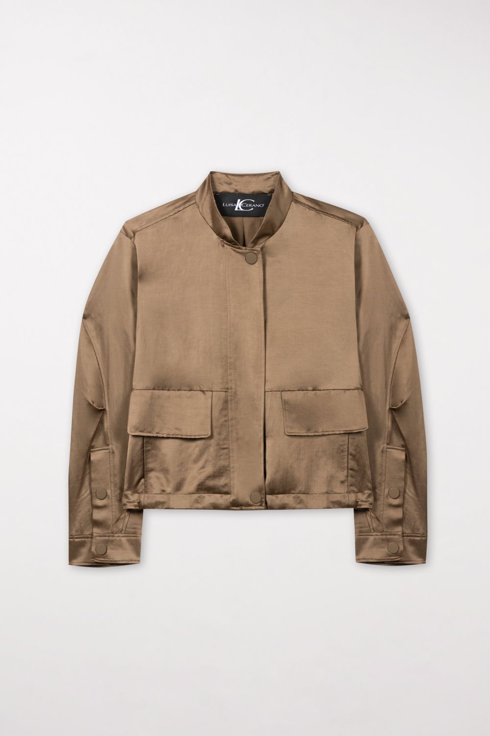 Спортивный объемный блузон из роскошного мерцающего атласа. Сложный крой дополнен планкой на кнопках, боковыми карманами, манжетами на пуговицах и регулируемой кулиской по низу.