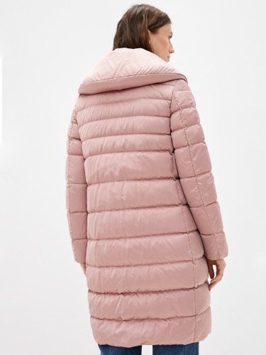Однотонные зимнее пальто в пыльно-розовой расцветке. Натуральный пуховый наполнитель с добавлением пера. Застежка на молнию, ветрозащитная планка. Воротник стойка. Два боковых кармана с листочкой, плюс внутренний карман.