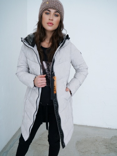 Стеганое однотонное пальто с синтепоном наполнителем. Контрастная молния. Объемный капюшон, боковые карманы с листочкой.