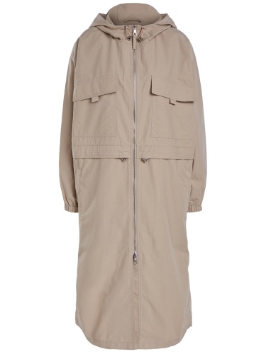 Однотонный плащ в трендовой нюдовой расцветке. Глубокий капюшон с кулиской, воротник-стойка. Кулиска на поясе позволяет создать приталенный силуэт. Объемные накладные карманы на груди, спущенная линия плеч.