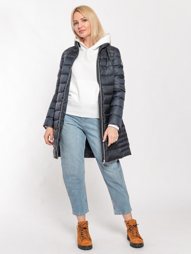Стеганая однотонная куртка длиной до середины бедра. Застежка молния, боковые карманы на молнии.