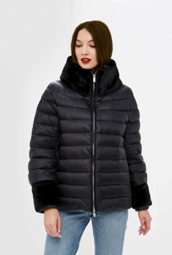Укороченная стёганая куртка чёрного цвета с интересными съёмными манжетами и воротником. А-образный силуэт. Cъемная отделка из искусственного меха по воротнику и манжетам. Горизонтальная стежка. Водоотталкивающая ткань.