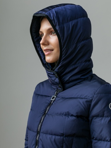 На сайте указаны российские размеры. Короткая пуховая куртка спортивного стиля. Карманы на молнии. Рукава оформлены замком-молнией. Капюшон фиксируется спереди кнопками, что позволяет защитить шею от ветра и холода.