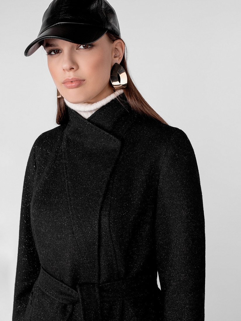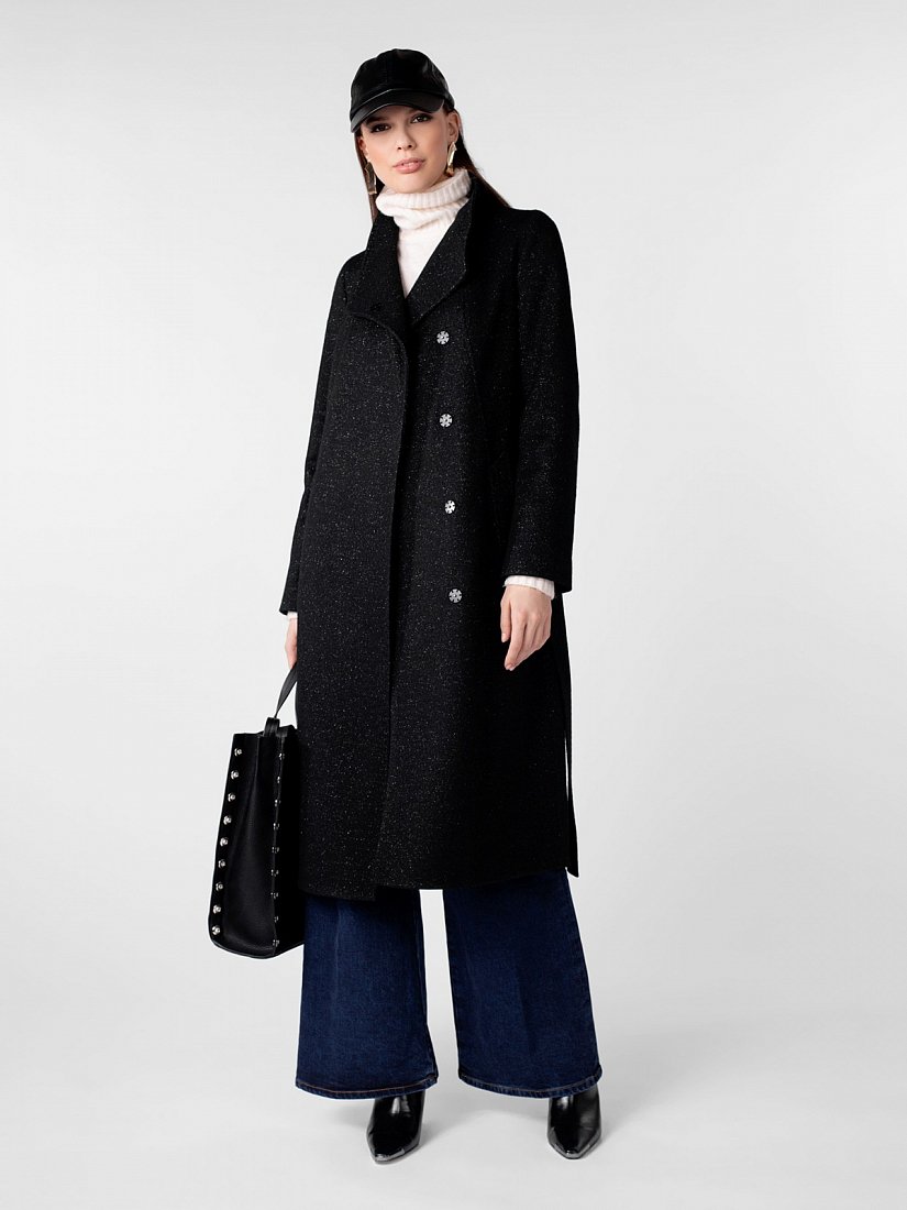 Пальто полуприлегающего силуэта длиной ниже колена. Втачной рукав, застёжка на пришивные кнопки, воротник-стойка, рельефы на полочке, карманы-листочки, пояс, шлица в среднем шве спинки. Изделие декорировано тамбурной строчкой. Произведено с ветрозащитной мембраной Raft Pro. Утепленная спинка по технологии Eurowinter. Утеплитель из биопуха DuPont Sorona. Изготовлено из шерстяного твида чёрного цвета с люрексом.