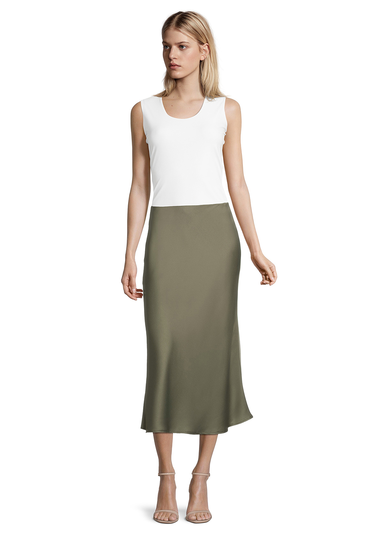 Юбка миди, облегающая в бедрах и расширяющаяся книзу - очень женственная модель. Материал юбки имеет приятный атасный блеск, создающий роскошный образ. Модель застегивается на молнию сбоку.