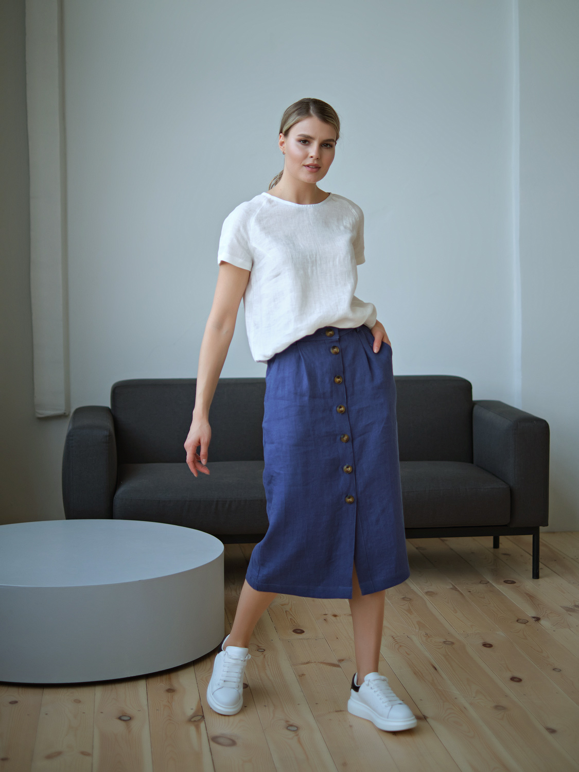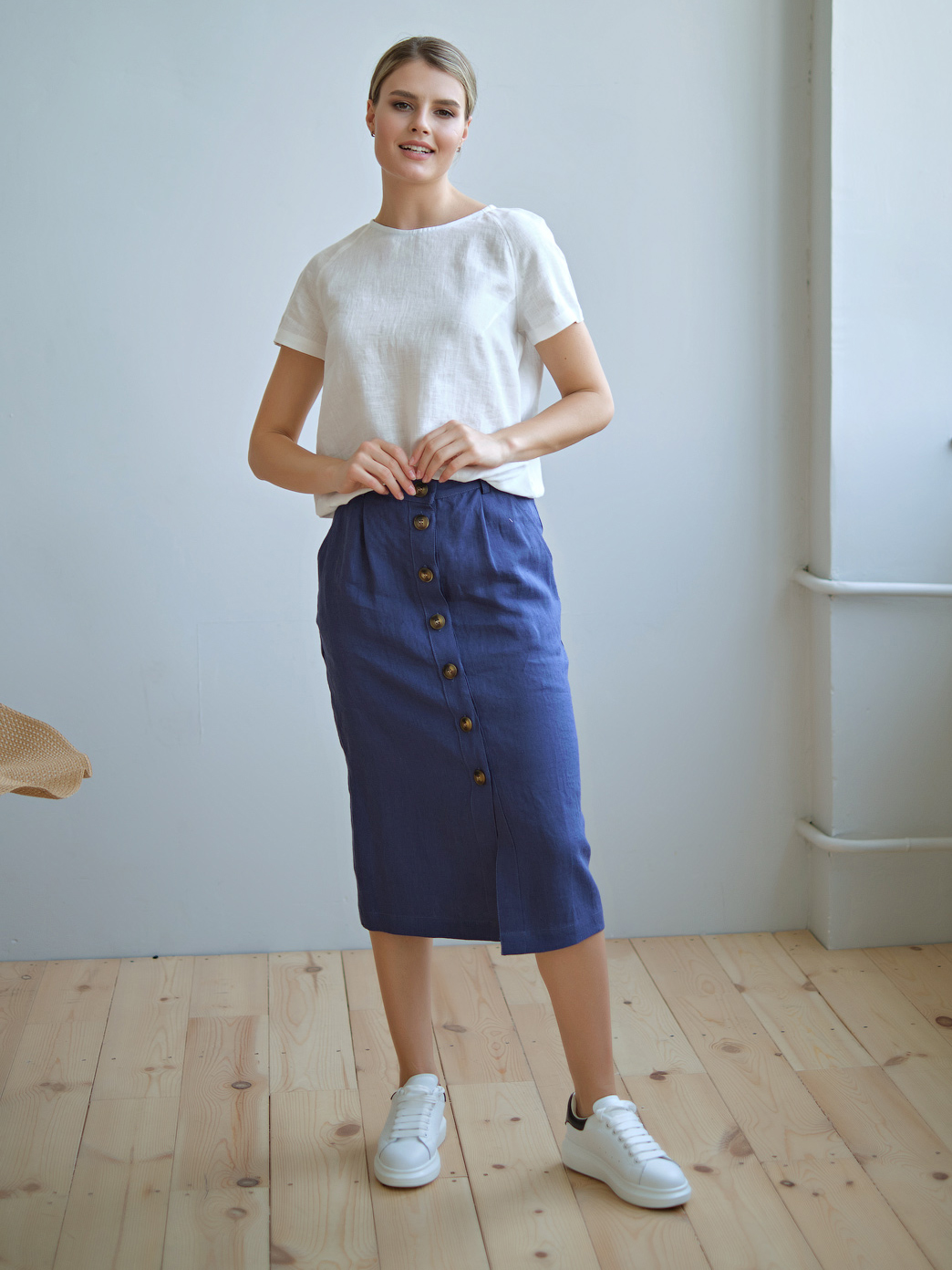 На сайте указаны российские размеры. Ткань: юбка из 100 натурального льна, идеально дышащего и комфортного материала. Крой: юбка прямого силуэта по типу «карандаш» имеет достойную длину ниже колена, что позволяет выбирать эту модель женщинам разных комплекций. Застежка-планка с пуговицами – универсальная модель, которую выбирают не только за стильный внешний вид, но и за комфорт – расстегнув одну или несколько пуговиц, можно добиться идеального комфорта при шаге. Красивые защипы в области пояса подчеркивают талию и добавляют романтичности всему образу. Небольшие, но удобные карманы функциональны и готовы выполнить свое предназначение. Отделка: стильный черничный оттенок придает юбке джинсовое звучание, а контрастные пуговицы в природном цвете только подчеркивают несравненный стиль. Юбка комбинируется с блузками, рубашками, тонкими водолазками и вязаными джемперами.