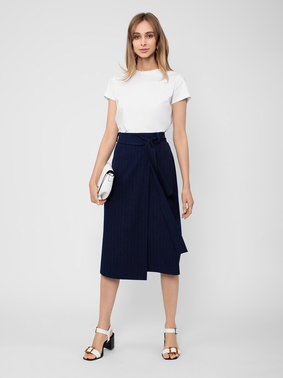 Юбка из костюмной ткани в полоску силуэта трапеция на притачном поясе со шлевками. Спереди декоративный запах треугольной формы. Сзади пояс на резинке. В комплект входит широкий съемный пояс из основной ткани.