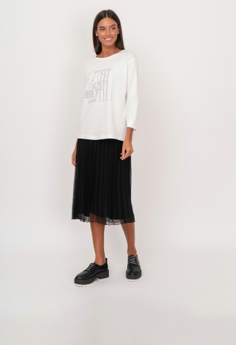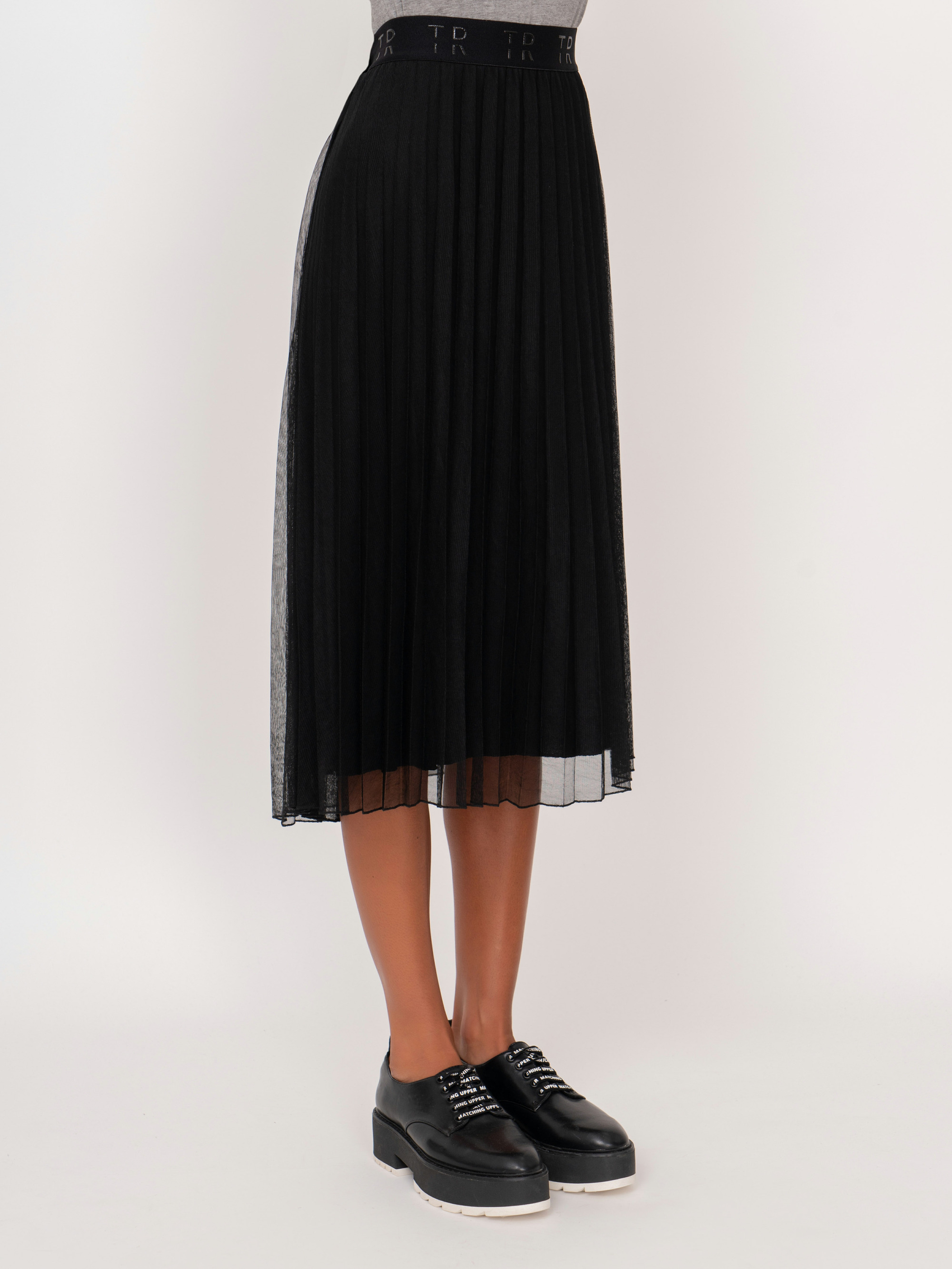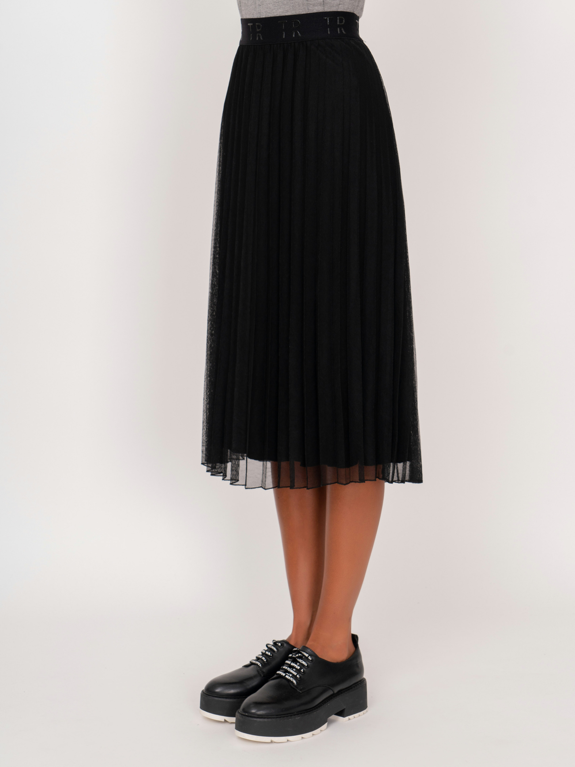 На сайте указаны российские размеры. Черная плиссированная миди юбка трапеция на резинке. Рост модели: 175 см. Длина юбки: 70 см.