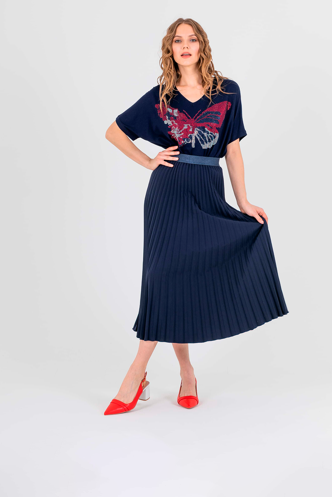 Легкая юбка полусолнце длиной до щиколоток, дизайнерская особенность модели – плиссировка. Верх юбки обработан резинкой.
