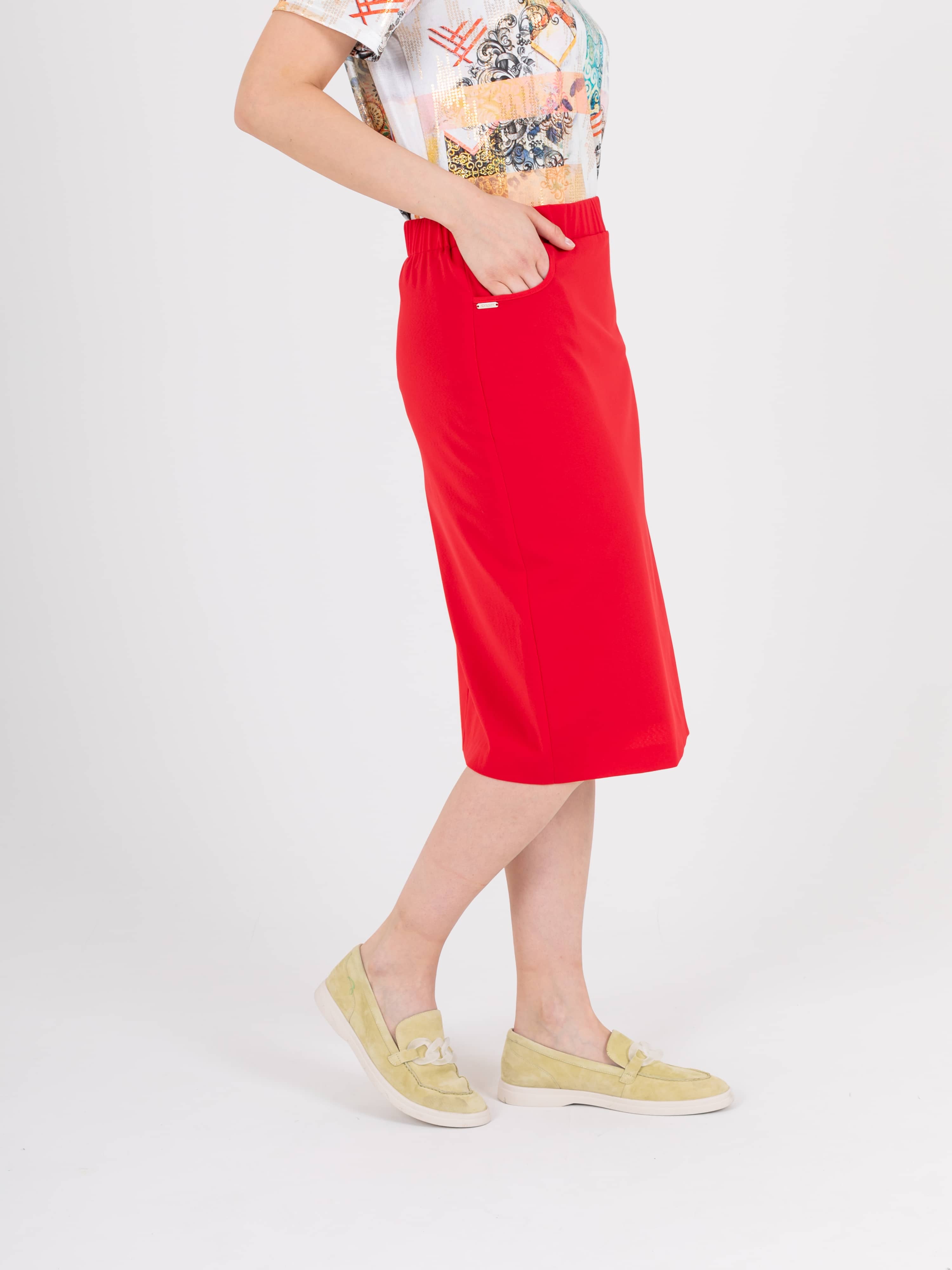 Яркая юбка-карандаш длиной ниже колена из полиэстера с добавлением мягкой вискозы и эластана. На переднем полотнище юбки расположены два кармана с отрезным бочком. Верх юбки обработан поясом на резинке.