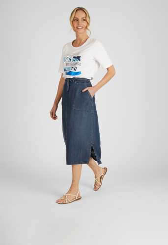 Эта джинсовая юбка - идеальный предмет весеннего гардероба! Длина до икры, два боковых кармана и свободный крой обеспечивают свободу движений. Эластичная лента и шнурки обеспечивают индивидуальную регулировку по фигуре. Модный джинсовый образ придает юбке повседневный вид, что делает ее идеальной для повседневного ношения. Общая длина в размере 46: 80см