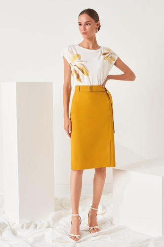 Юбка прямого силуэта на подкладке, выполнена из костюмного полотна. Притачной пояс со шлевками. Спереди выполнен деликатный разрез. Дополняется поясом из основного полотна с прямоугольными пряжками.