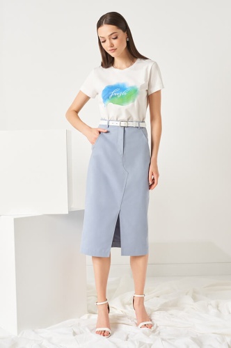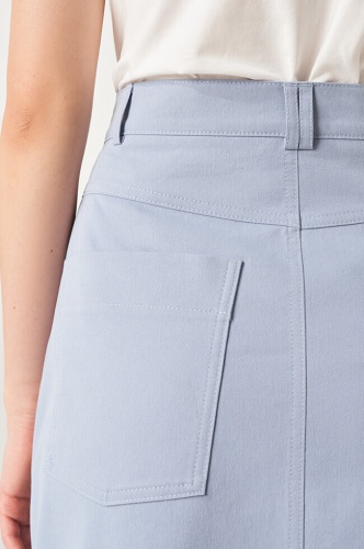 Прямая юбка миди из денима. Притачной пояс со шлевками. Застежка на молнию и пуговицу. Спереди косые боковые карманы. Спереди фигурный центральный шов заканчивается разрезом. Спинка с кокеткой и накладными карманами.