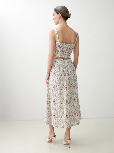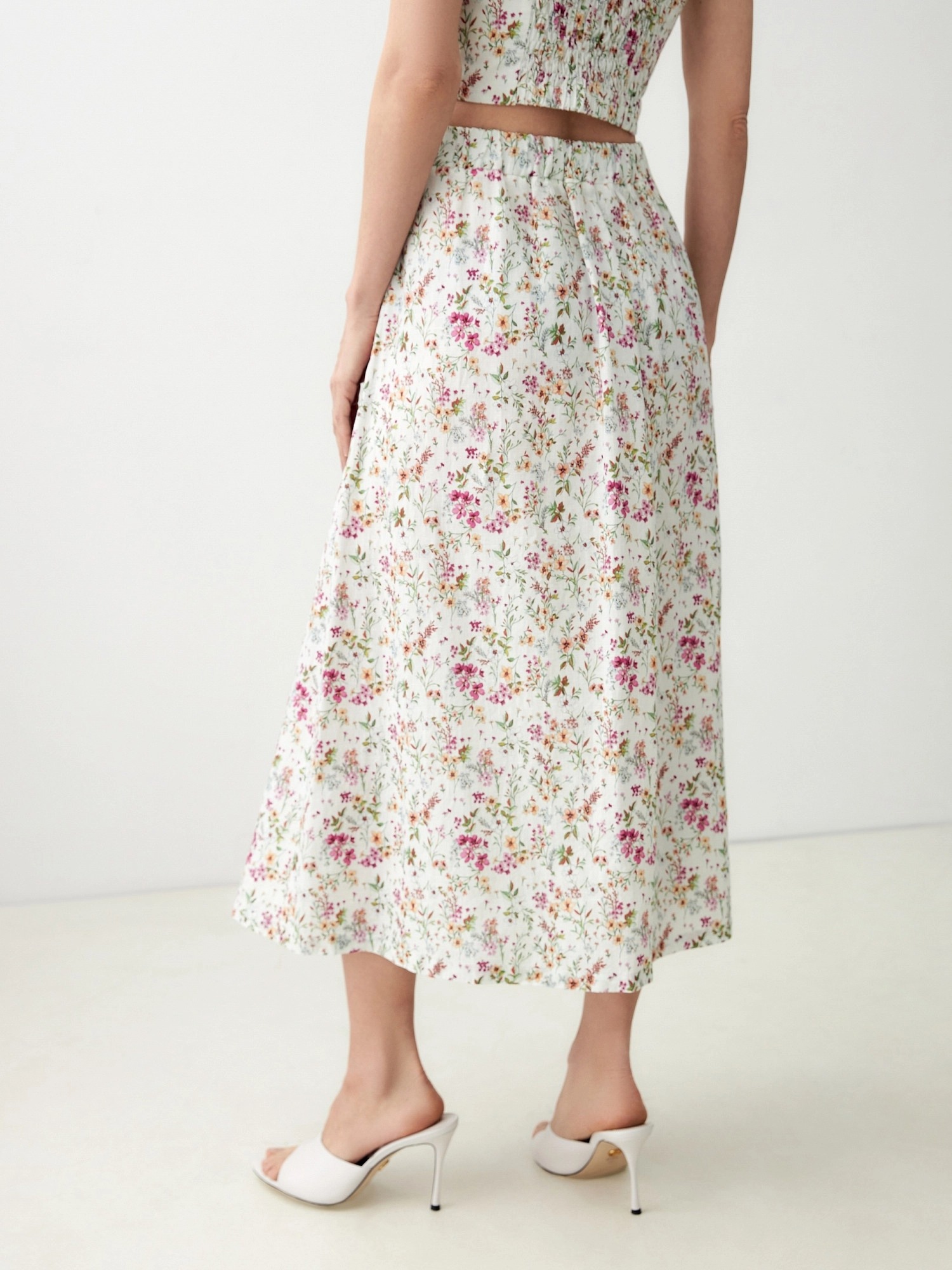 Романтичная миди юбка из принтованной льняной ткани с застежкой по переду на кокосовые пуговицы, на подкройном поясе. На спинке резинка. Юбка с двумя функциональными карманами по бокам. Соберите идеальный образ с жакетом (арт. 3100081MB0590)