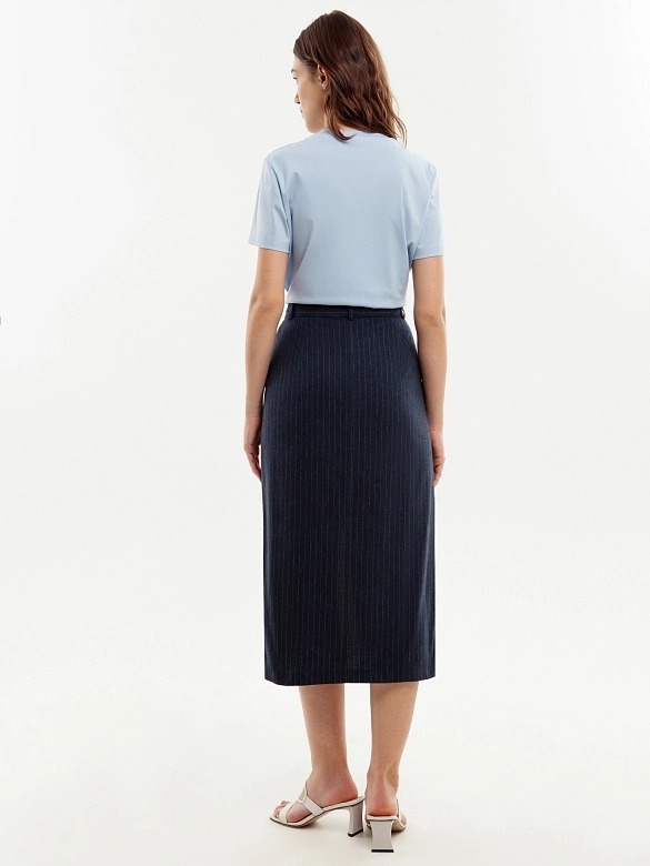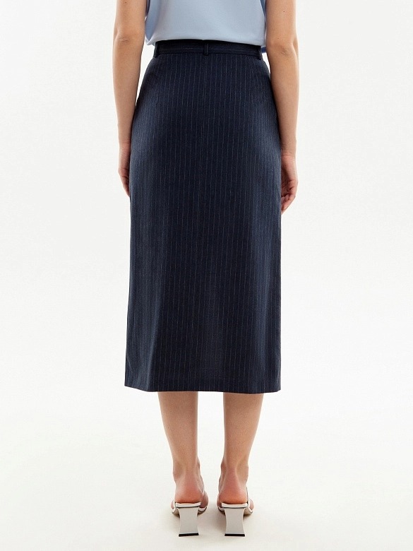 Прямая юбка длины миди, на талии с гульфиком по центру, на притачном поясе со шлевками. Разрез спереди по центру. Юбка из 100% хлопковой костюмной ткани в тонкую полоску. Рабочие карманы по бокам.