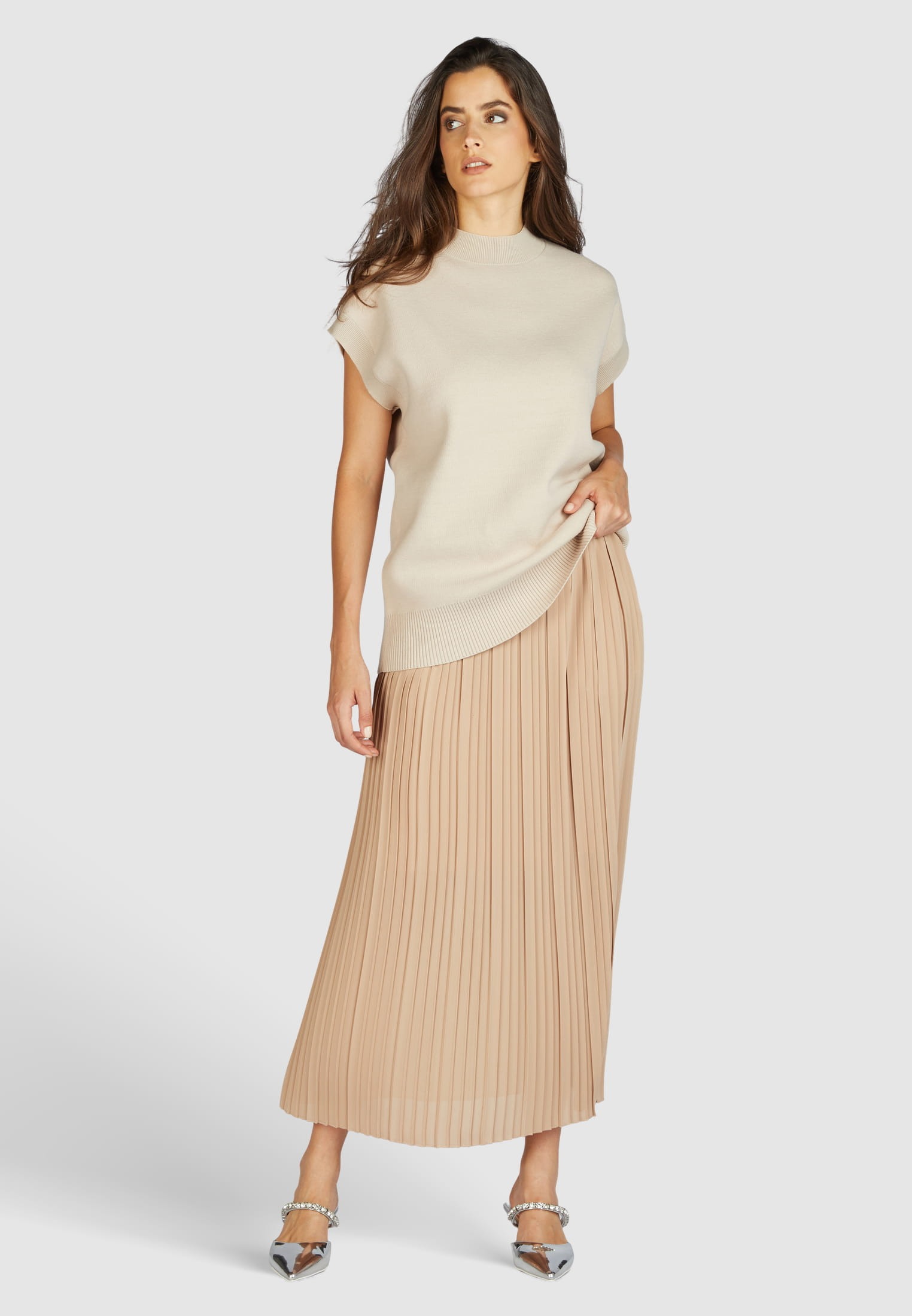Эта высококачественная юбка-миди прямого Н-образного силуэта дополнена эластичными манжетами и завязкой на шнурке. Модель из плиссированного крепа отличается особой мягкостью, ее плавный дизайн обеспечивает удобство в ношении и бескомпромиссный женственный вид.