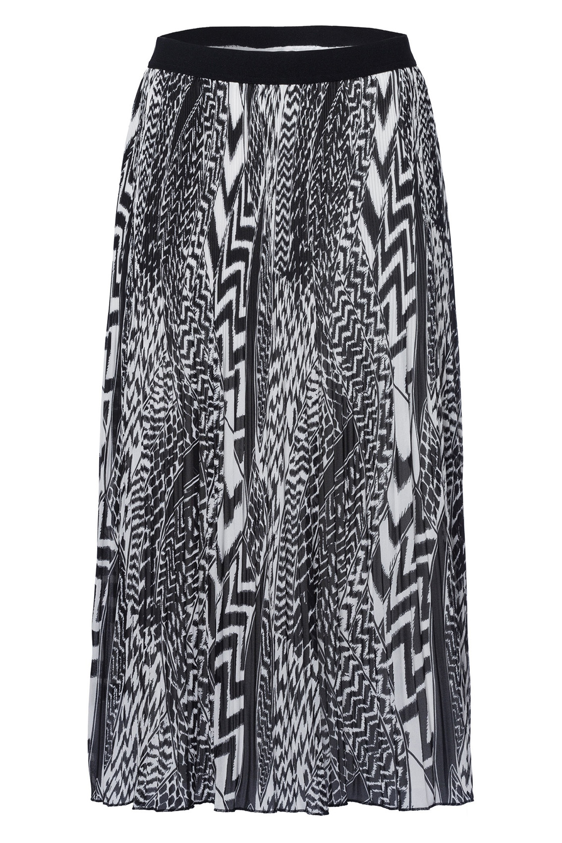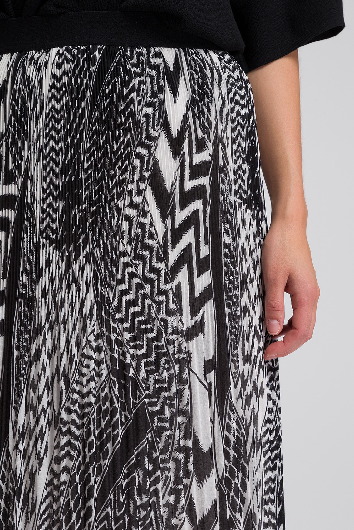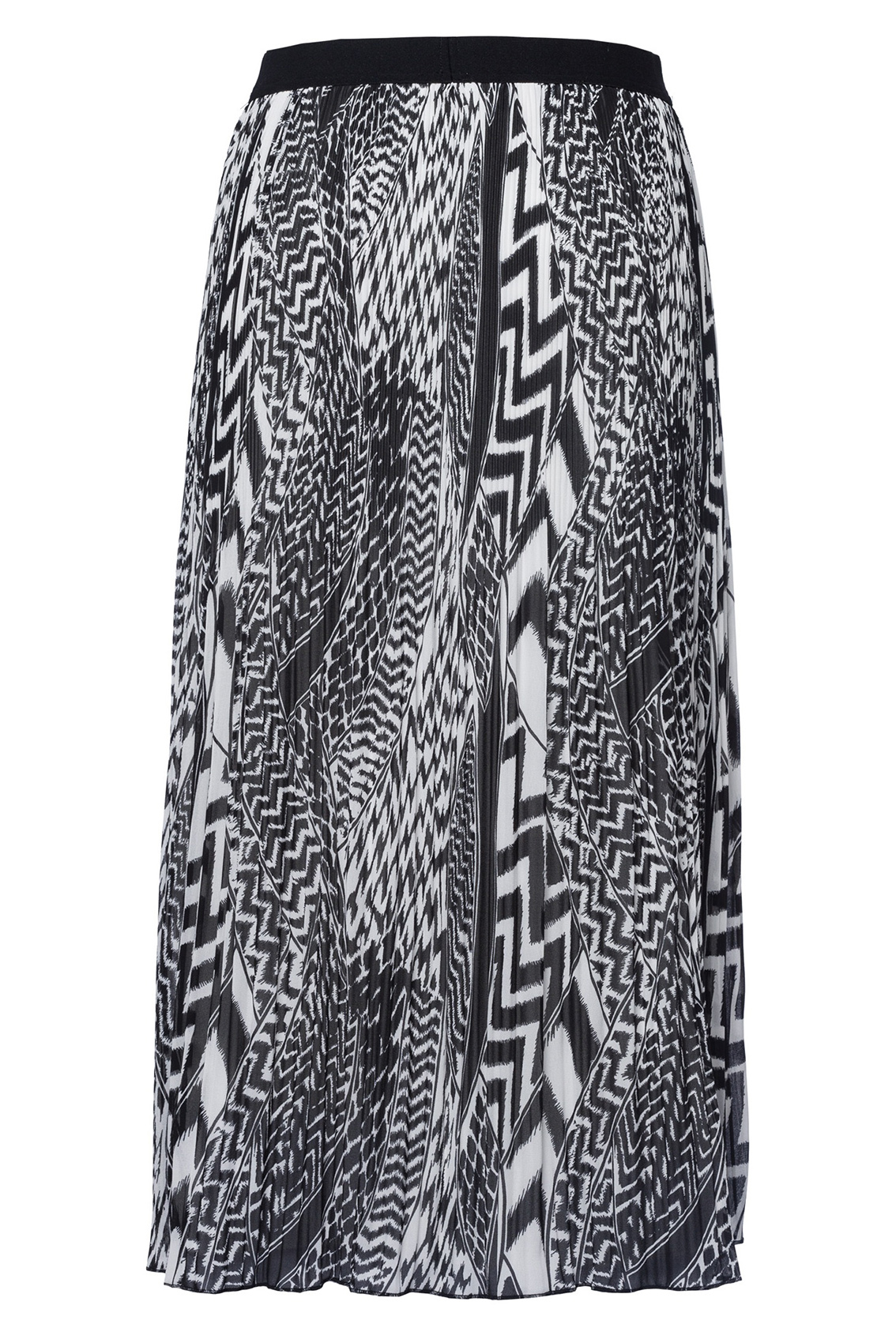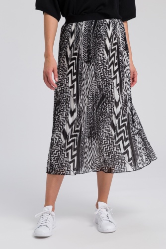 Плиссированная юбка с абстрактным принтом. Трендовая длина миди. Эластичный пояс обеспечивает комфортную посадку. Застежка и карманы отсутствуют.